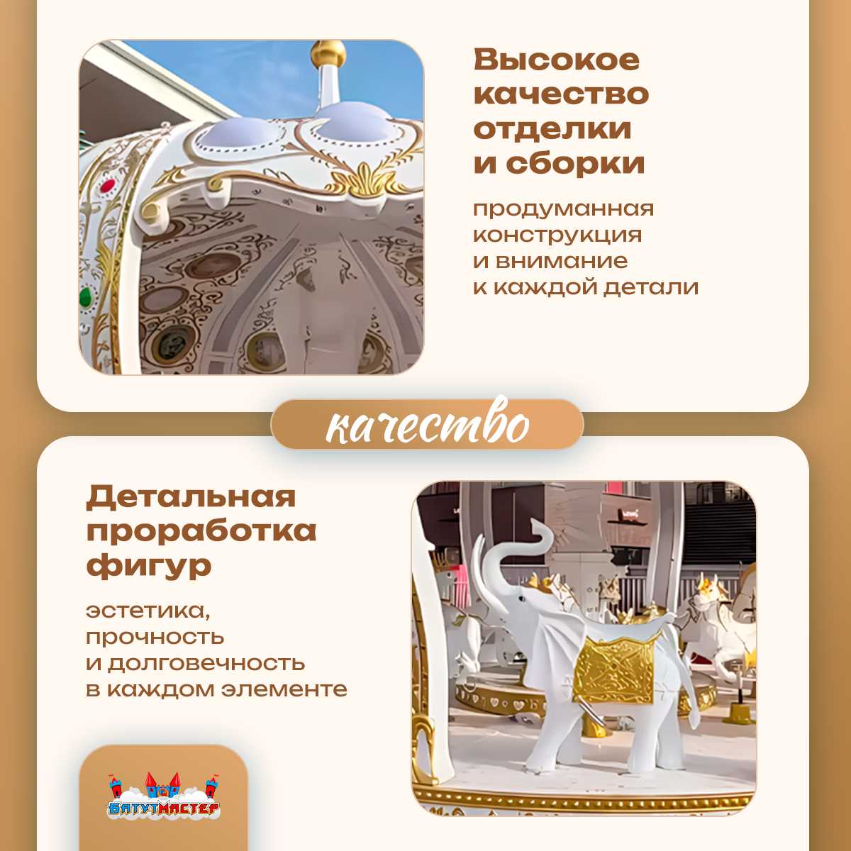 Карусель «Сказка» изготавливается в роскошных белых и золотых оттенках, что придает ей утонченность и элегантность. В оформлении карусели использованы не только традиционные элементы, но и удивительные фигурки слонят, что делает её абсолютно уникальной. Эти очаровательные слоники в золотых украшениях и изысканных позах привносят элемент экзотики, делая аттракцион особенно привлекательным для гостей.