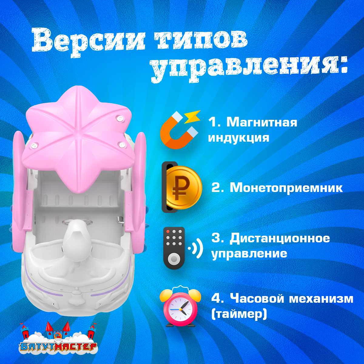 ✅ Управление лодкой осуществляется с помощью одного из пяти вариантов управления — на выбор владельца. Это даёт гибкость при установке лодки в разных форматах бизнеса: от автоматизированного аттракциона до управляемого оператором.