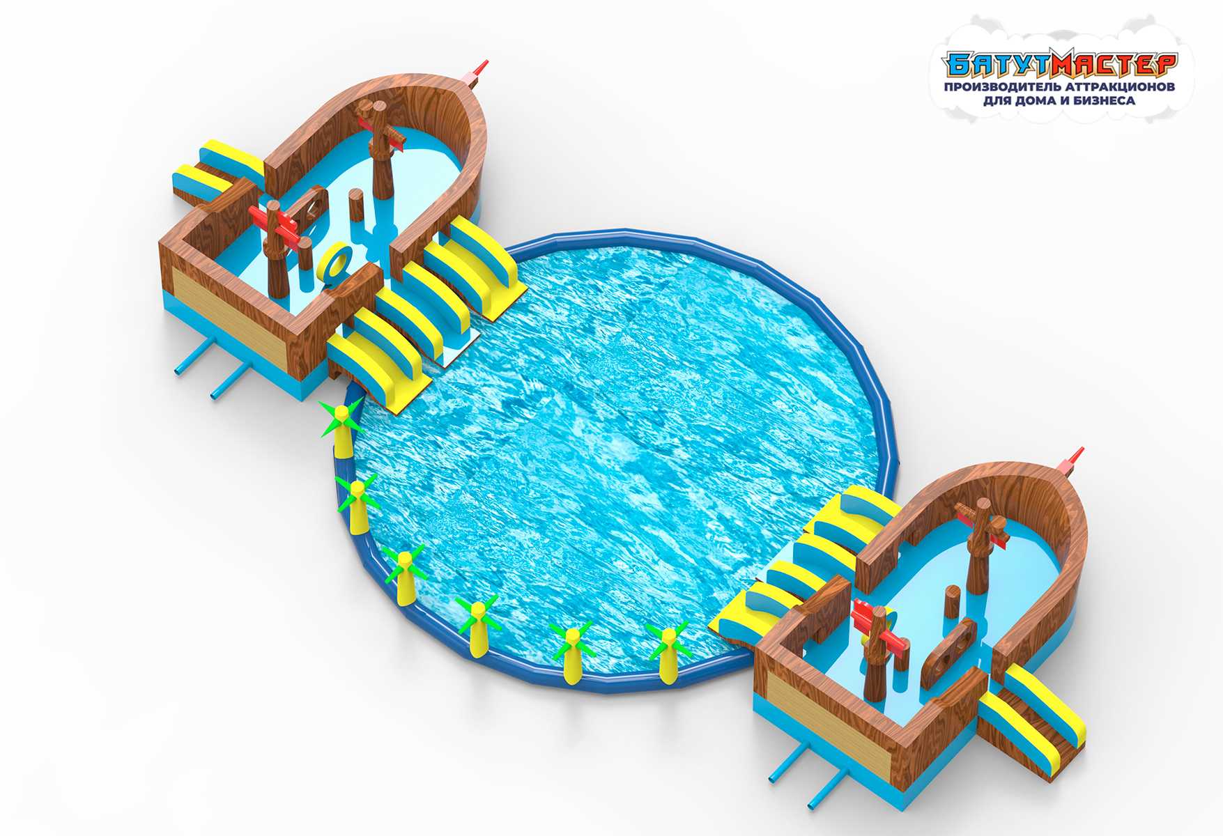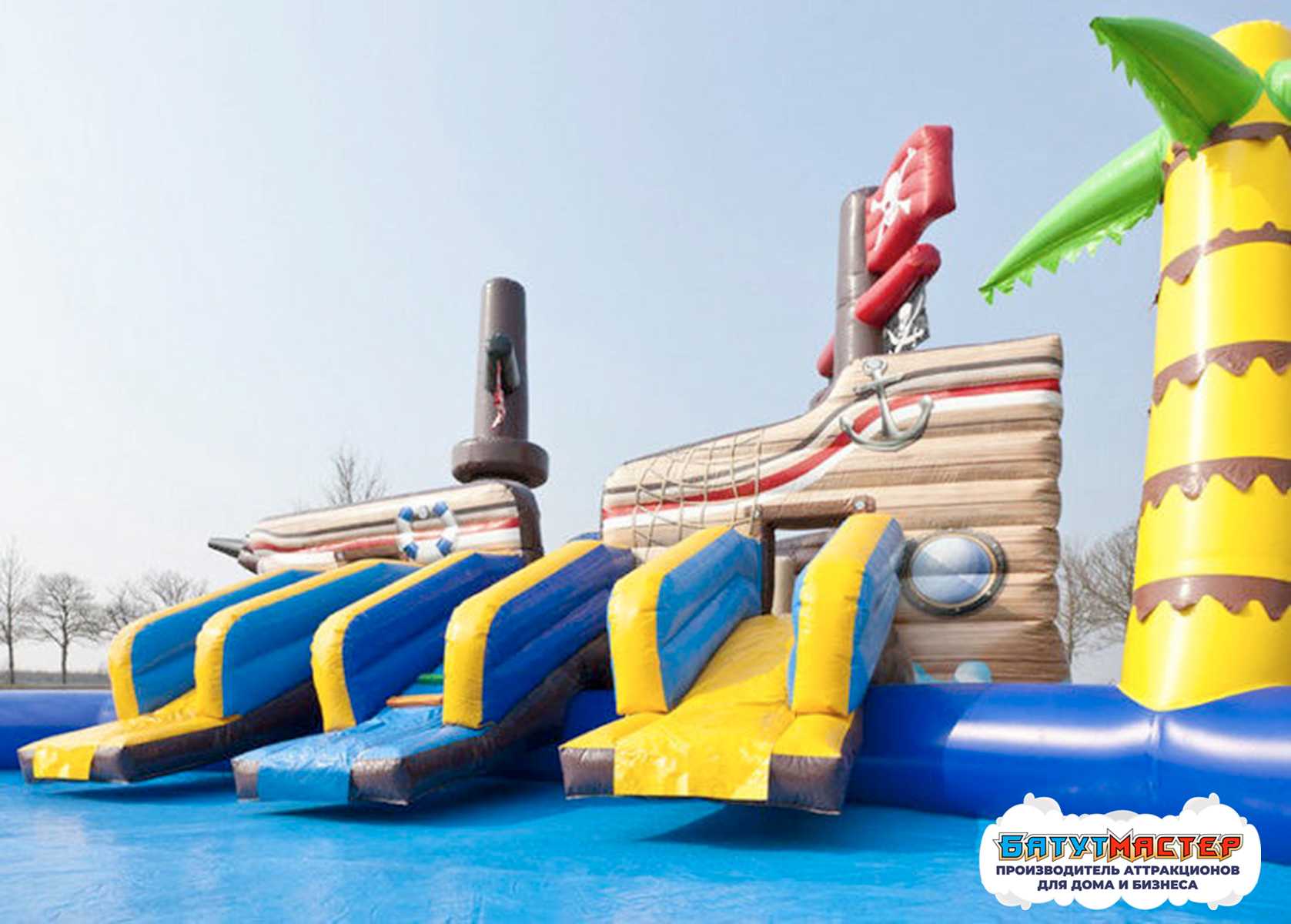 - Надувной пиратский корабль: Это сердце всего аквапарка! Сюда можно попасть, поднявшись по лестнице и отправиться в незабываемое путешествие по скользким водным горкам. Этот корабль станет центром веселья для всей вашей компании! ⛵