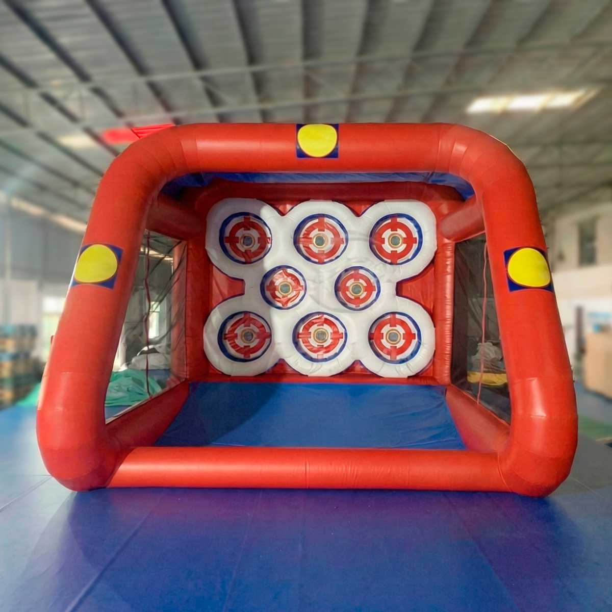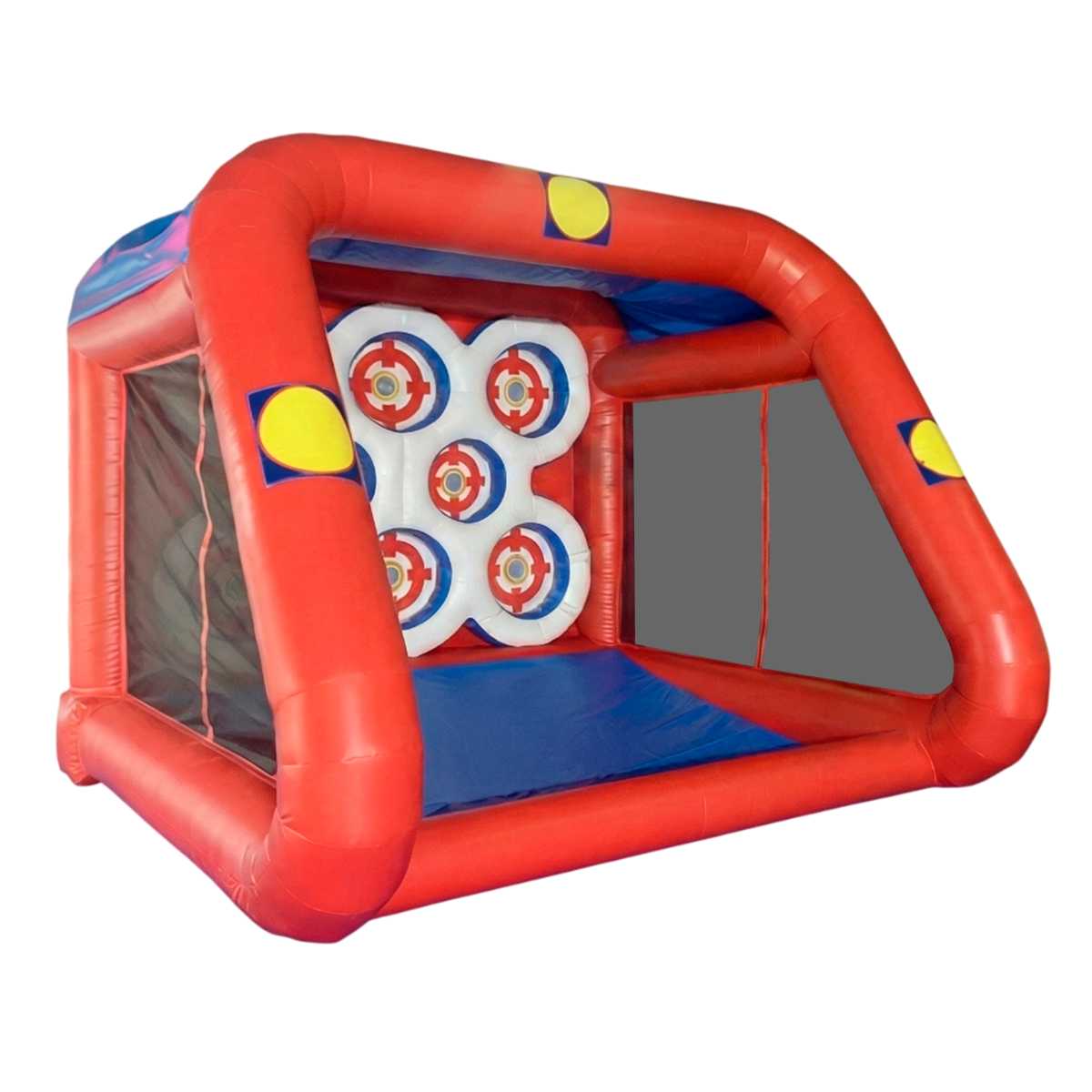 «Целься и побеждай» — это футбольный дартс в формате большой надувной арены. Участники выполняют удары по мячу, стараясь попасть в одну из мишеней на задней стенке. Каждая цель может быть оценена по очкам (по вашим правилам: например, центр — максимум, крайние — меньше).