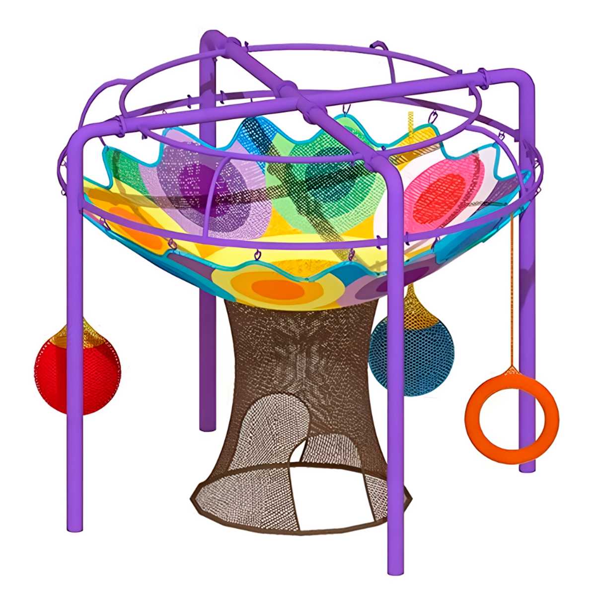 Многоуровневая структура представляет собой сетчатую чашу, закреплённую на прочном каркасе, с дополнительными элементами вроде подвесных шаров, сеточных лазов и мягких канатных дорожек.