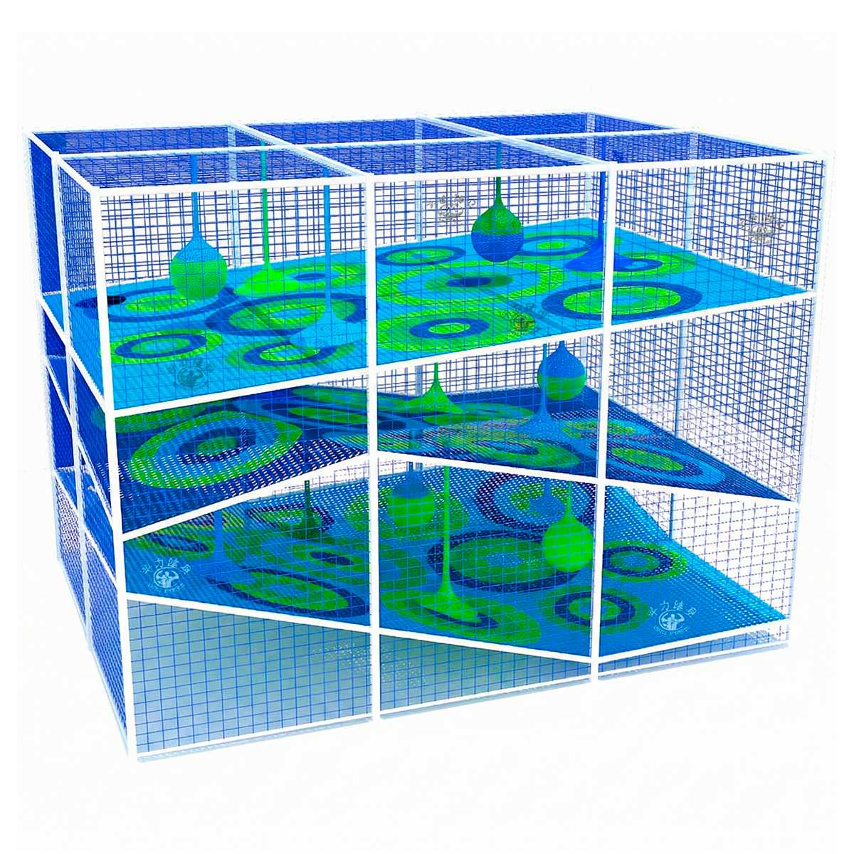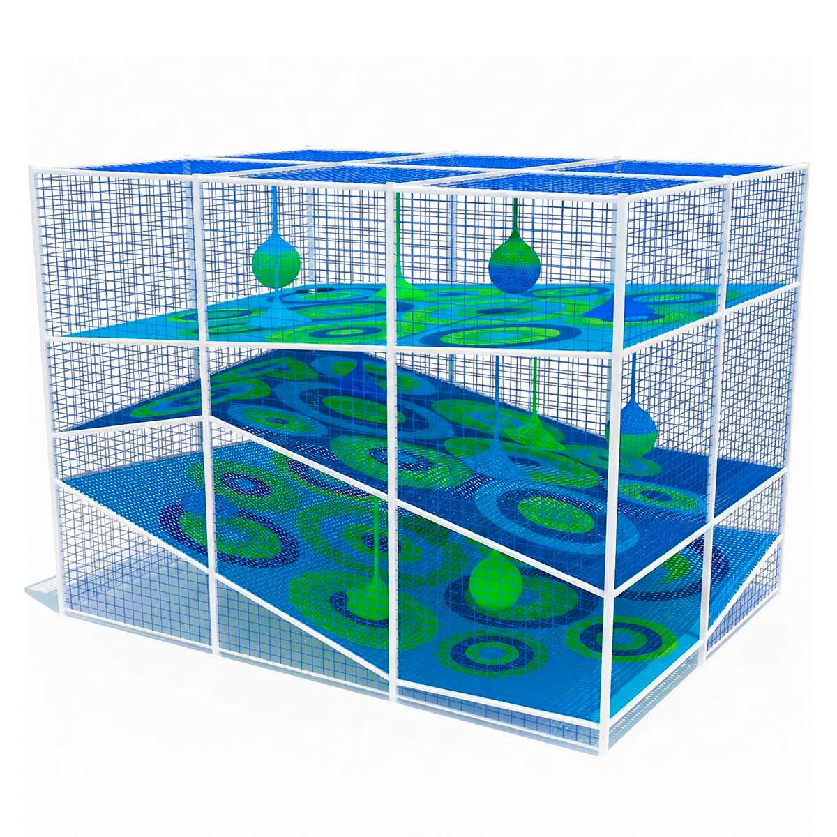 Это масштабная, многоуровневая и яркая конструкция из прочных нейлоновых сеток, предназначенная для активных игр, лазания, прыжков и преодоления препятствий. Конструкция разделена на три уровня, соединённых наклонными платформами, через которые дети могут беспрепятственно перемещаться, развивая при этом ловкость, координацию и уверенность в себе.