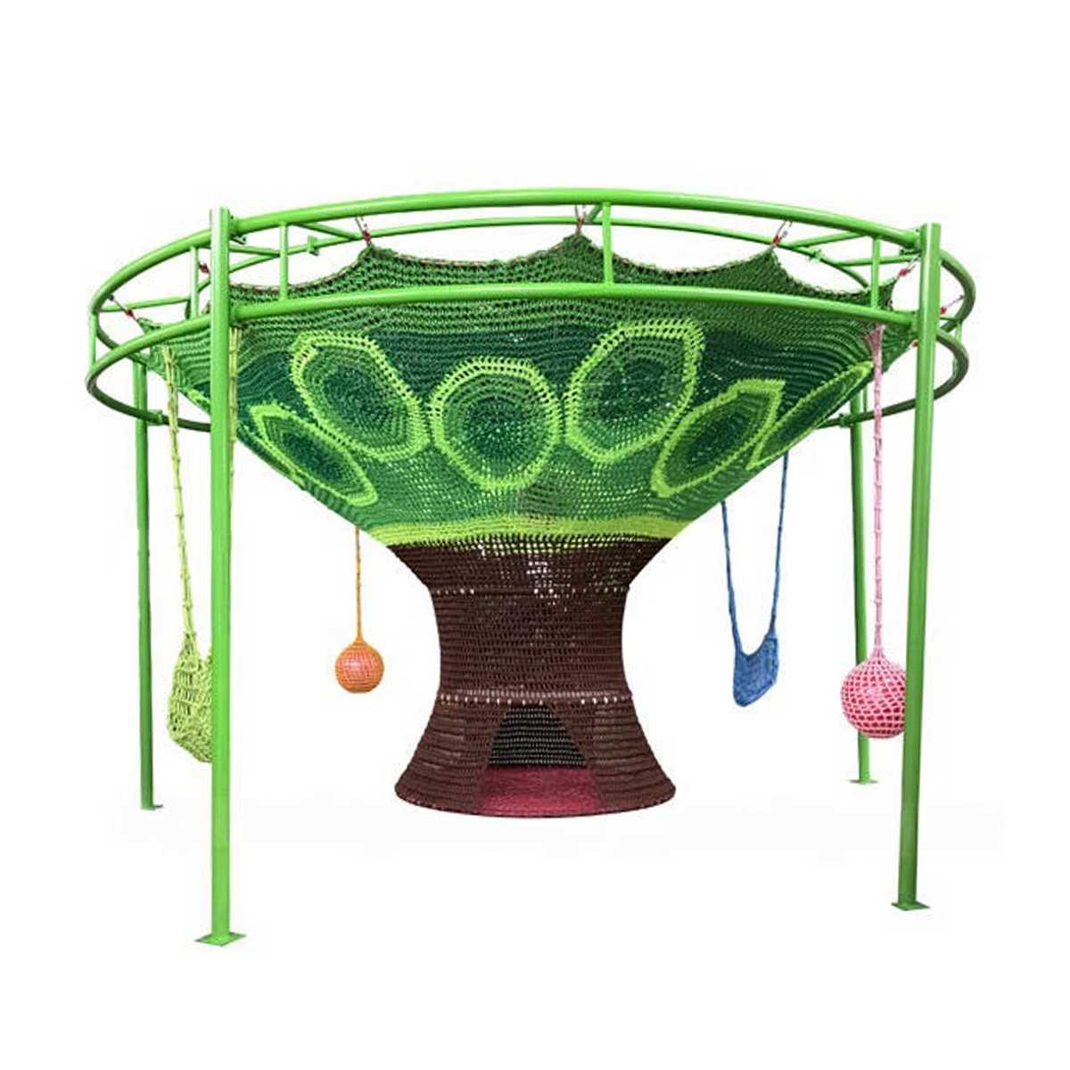 - Подвесные гнёзда, сетчатые качели и зоны отдыха внутри конструкции.