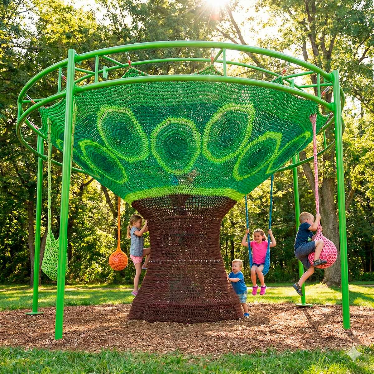 Канатый лабиринт «Летний день» выполнен в насыщенных природных оттенках, напоминающих ствол дерева и зелёную крону. Это создаёт ощущение уюта и приключения, будто ребёнок попадает в волшебный лес, где каждый элемент — часть игры и фантазии. Цветовое оформление стимулирует воображение и удерживает внимание надолго, создавая благоприятную атмосферу для весёлого и безопасного досуга.