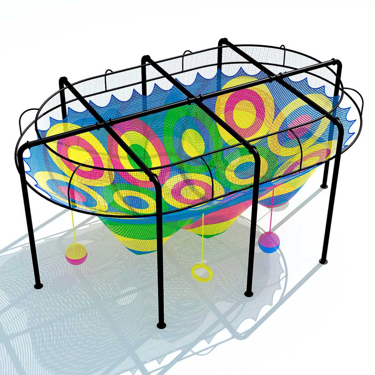 Комплекс представляет собой многоуровневую натянутую сетчатую конструкцию размером 10 метров в длину, 7 метров в ширину и 4 метра в высоту. Такй комплекс изготавливается из прочных нейлоновых канатов, которые устойчивы к износу и рассчитаны на интенсивную нагрузку. Благодаря своей модульности и гибкости конструкции, установка возможна как на металлический каркас, так и на потолочные крепления, что удобно при адаптации под разные типы помещений.