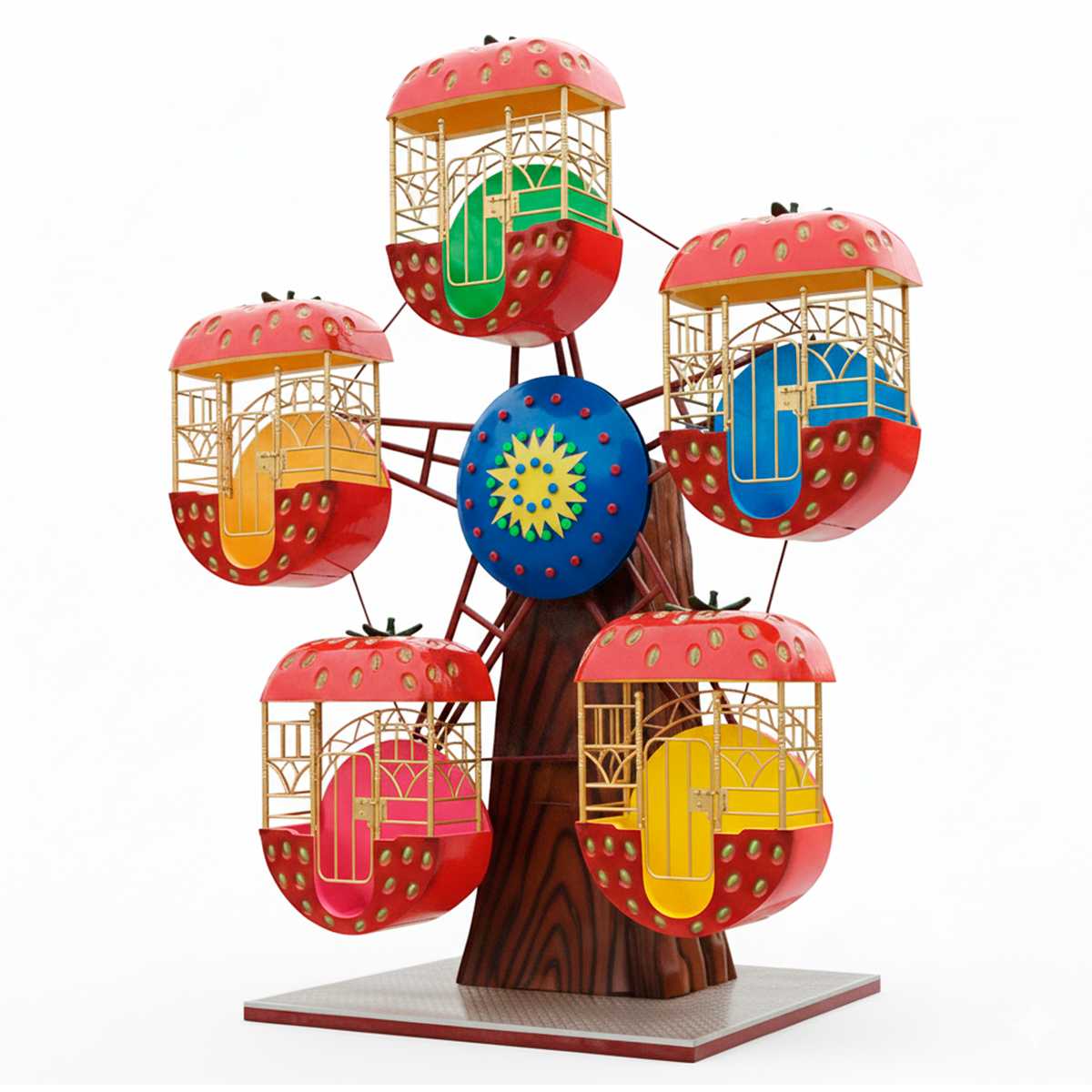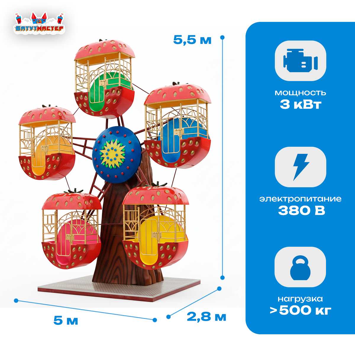 Колесо обозрения «Солнышко» — это не просто развлекательный аттракцион, а настоящее украшение любой площадки. С первого взгляда оно влюбляет в себя своим ярким, сказочным дизайном: кабины в форме аппетитных ягод, солнечные цвета и доброжелательная атмосфера превращают поездку в незабываемое приключение. Высота 5,5 метров делает аттракцион универсальным — он подойдёт как для закрытых помещений, так и для открытых площадок.