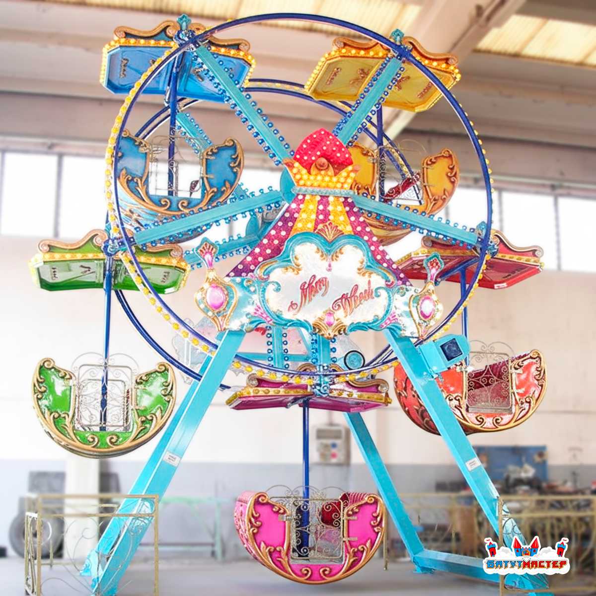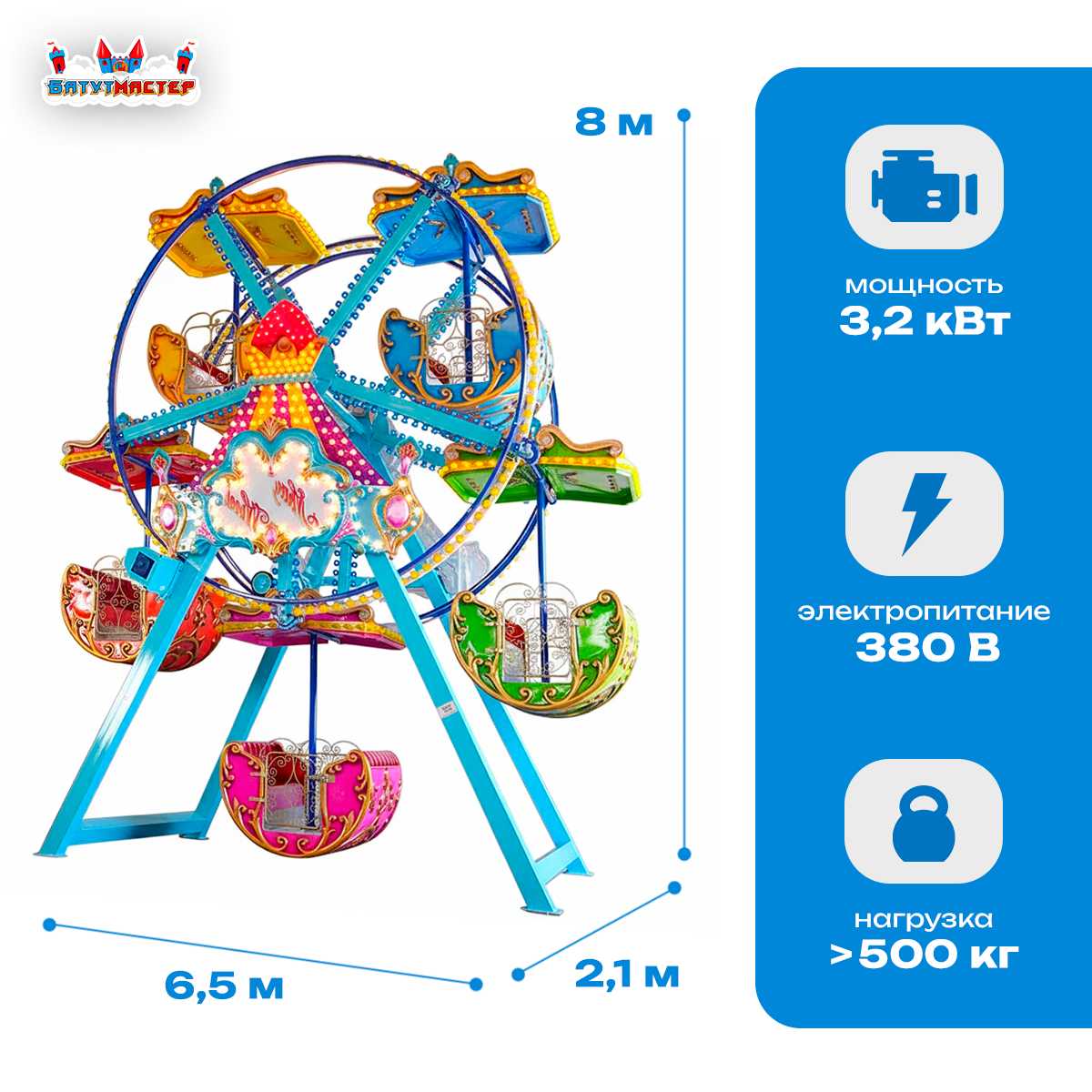 Колесо обозрения «Радуга» высотой 8 метров и габаритами 6,5×2,1×8 м — это яркий и надёжный аттракцион, способный стать центральной достопримечательностью вашей площадки. Его радужные кабинки, красочная LED-подсветка и плавное вращение создают атмосферу настоящей сказки. Такой аттракцион вызывает улыбки у детей и воспоминания у взрослых, а также становится отличной фотозоной и местом притяжения для гостей.