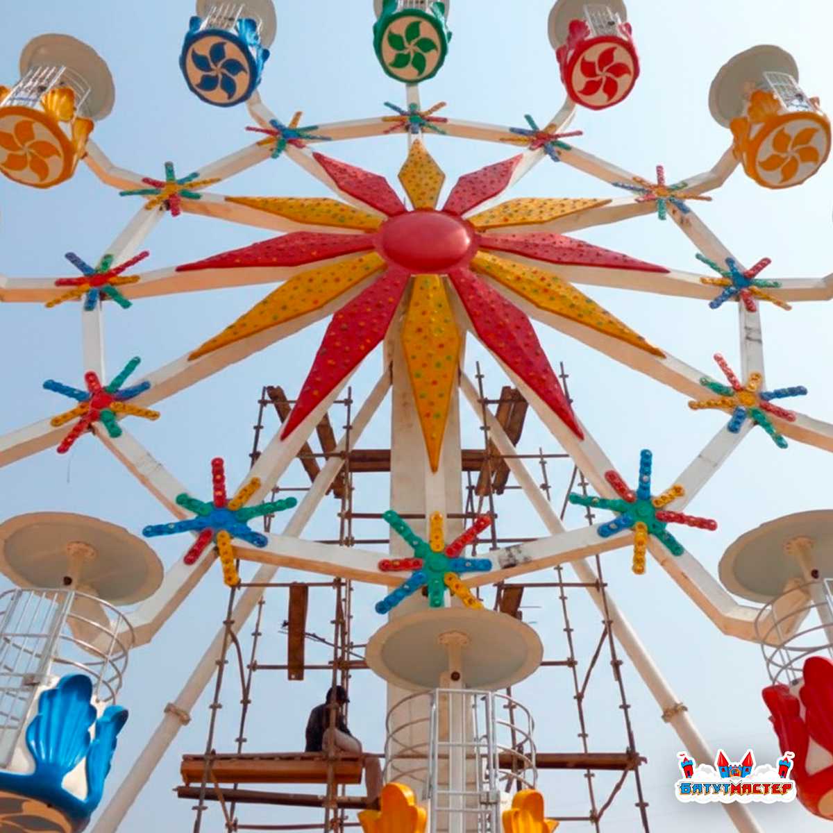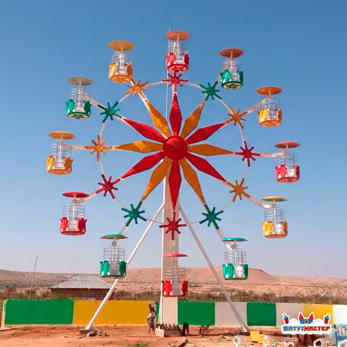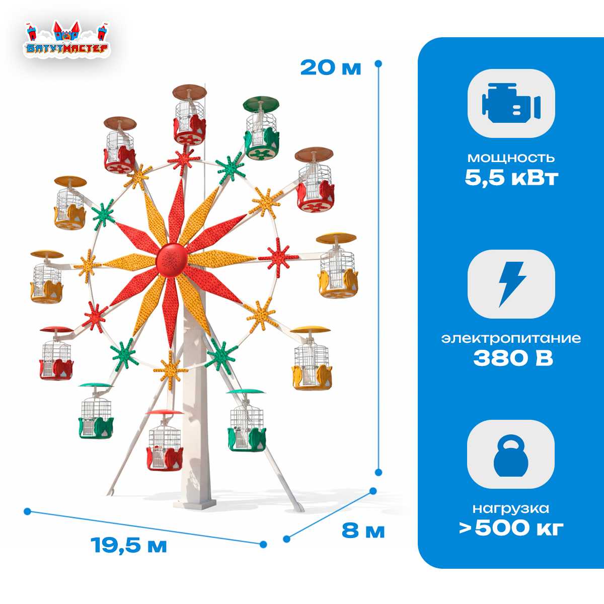 Колесо обозрения «Звезда» высотой 20 метров — это архитектурный акцент и бизнес-решение одновременно. Уникальный дизайн в виде яркого солнца с лучами и разноцветные кабинки делают его центром притяжения для детей, взрослых и туристов. Компактные размеры основания (19,5 м x 8 м) позволяют установить конструкцию даже в условиях ограниченного пространства — будь то городская площадь, парк культуры или развлекательная зона при торговом центре.