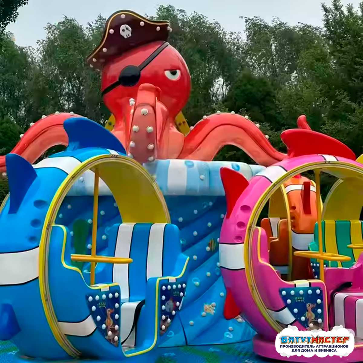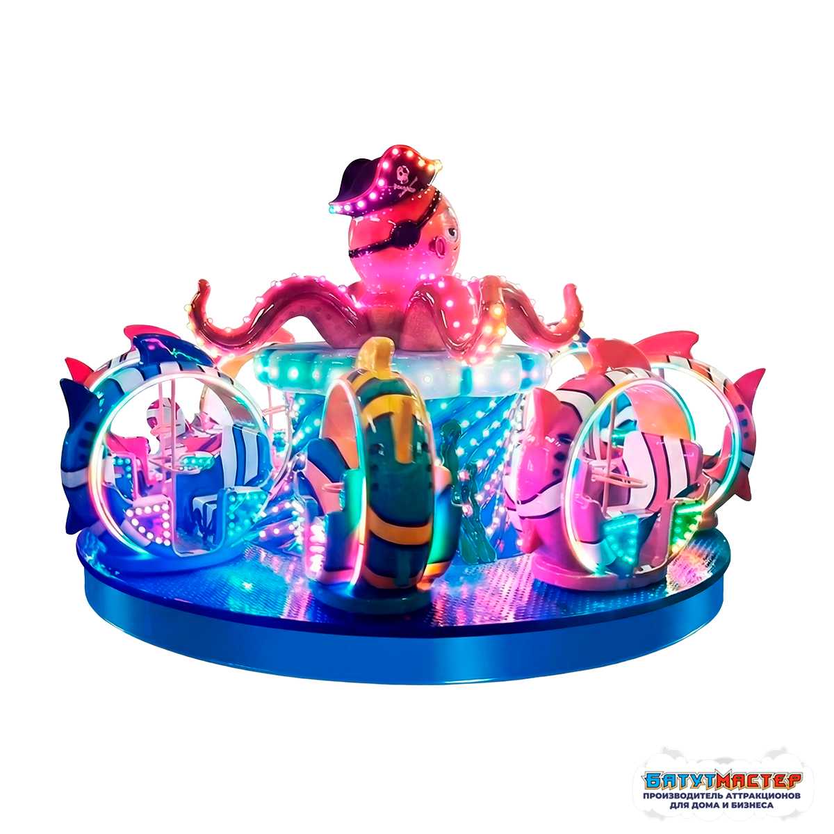 Аттракцион «Морские приключения» — это красочная карусель в морской тематике с выразительным центральным персонажем — осьминогом-пиратом. Благодаря продуманному дизайну и деталям, этот аттракцион не оставит равнодушным ни ребёнка, ни взрослого. Он оживляет любое пространство, наполняя его атмосферой подводного царства.