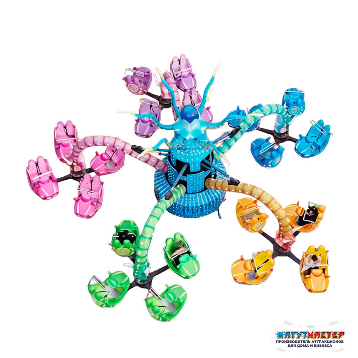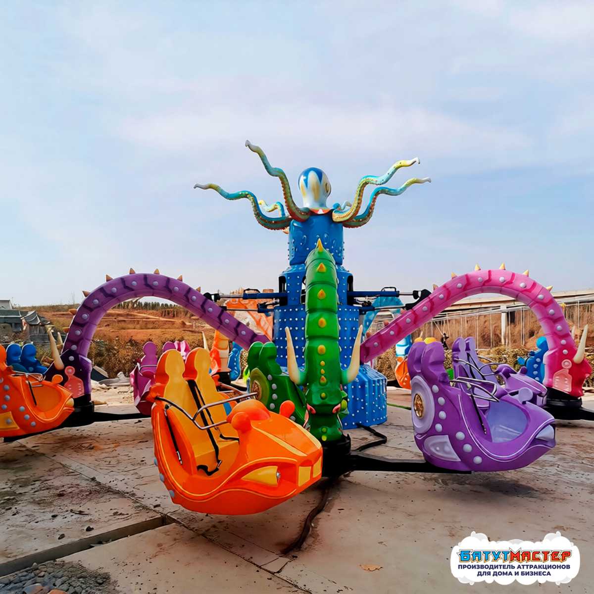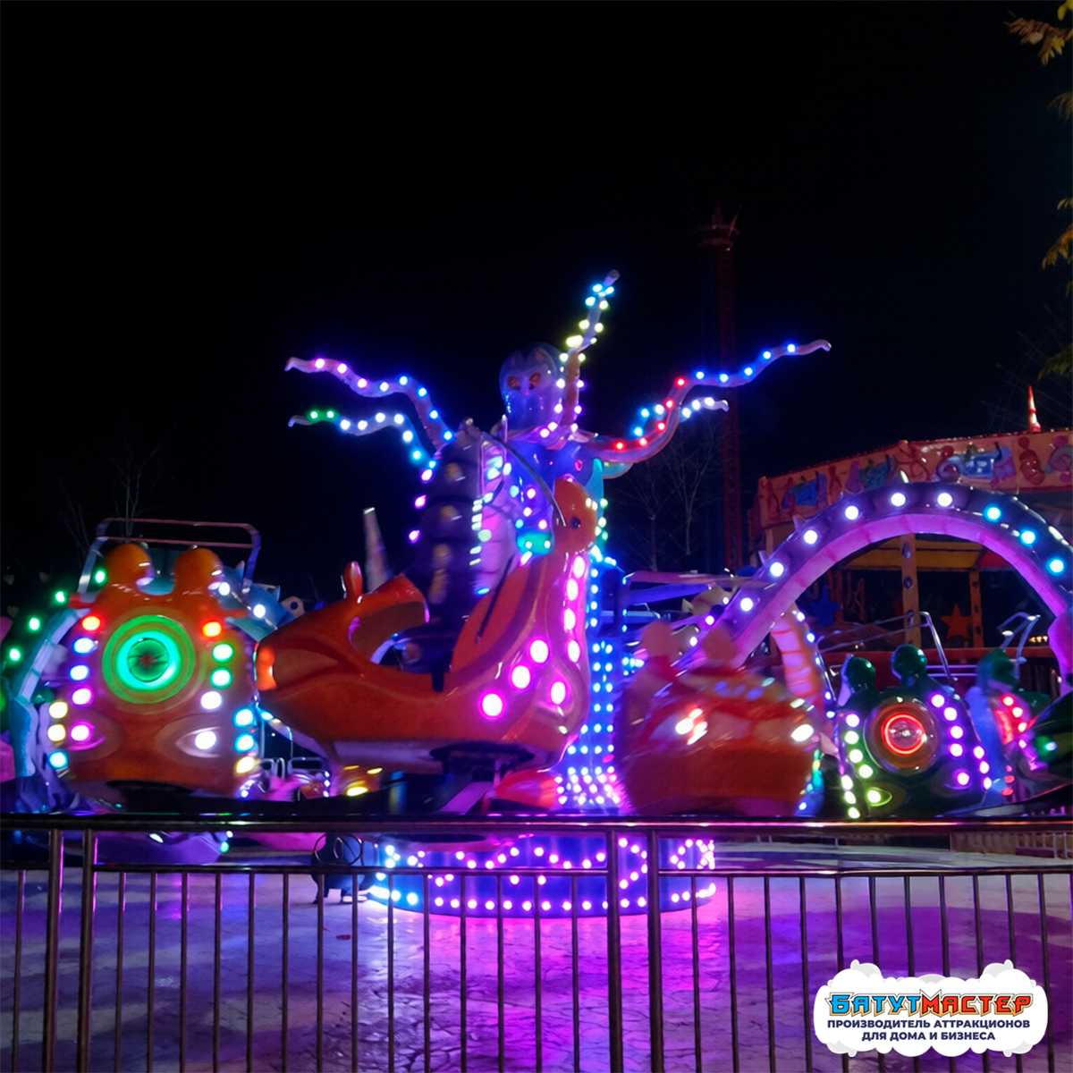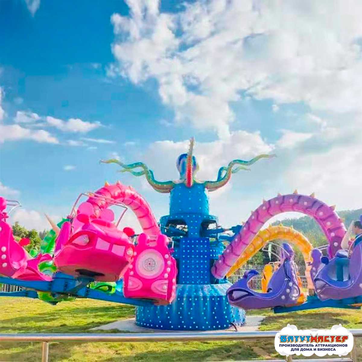 Аттракцион «Спрут Властелин морей» — это не просто карусель, а яркое и динамичное шоу, которое влюбляет в себя с первого взгляда. Стилизованный под морского осьминога, он не только выполняет функции аттракциона, но и становится ключевым визуальным акцентом всей развлекательной площадки. Центральная фигура — голубой осьминог с подвижными щупальцами — буквально оживает в движении, создавая иллюзию настоящего морского существа, приглашающего гостей на незабываемую прогулку.