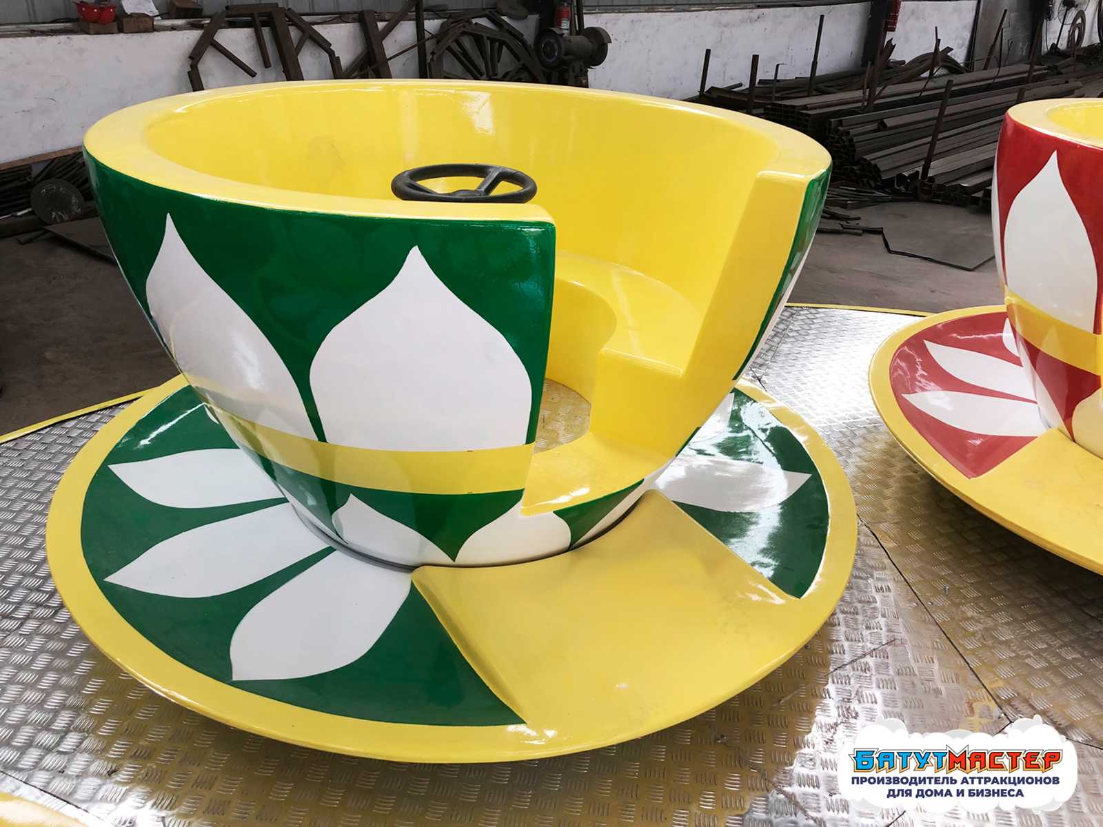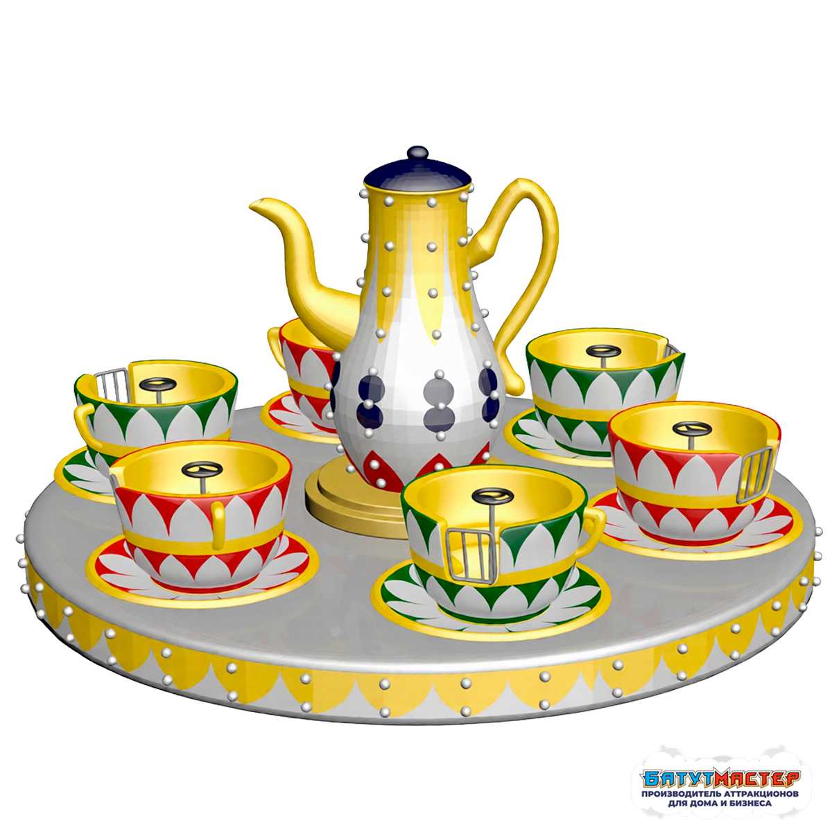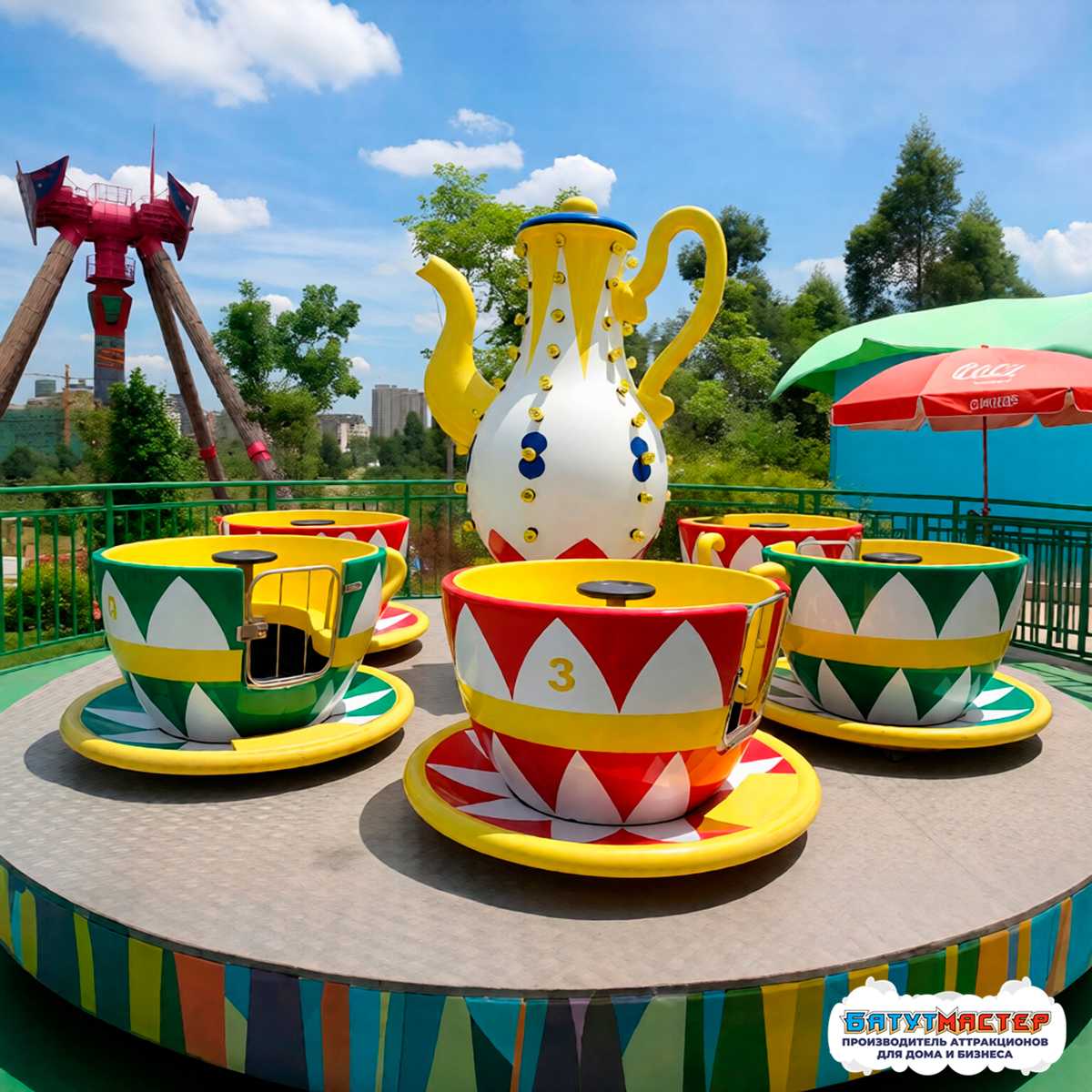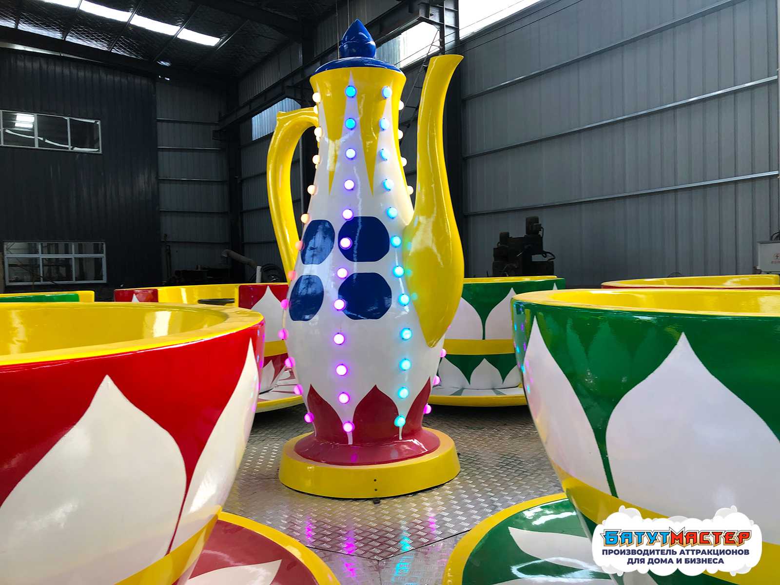 В основе конструкции — прочная платформа диаметром 7 метров. В центре установлен декоративный чайник, а по кругу — шесть вместительных чашек, каждая рассчитана на двух человек. Чашки вращаются не только вместе с платформой, но и индивидуально, благодаря встроенному механизму свободного вращения — это создаёт эффект «двойного кружения», который вызывает восторг.