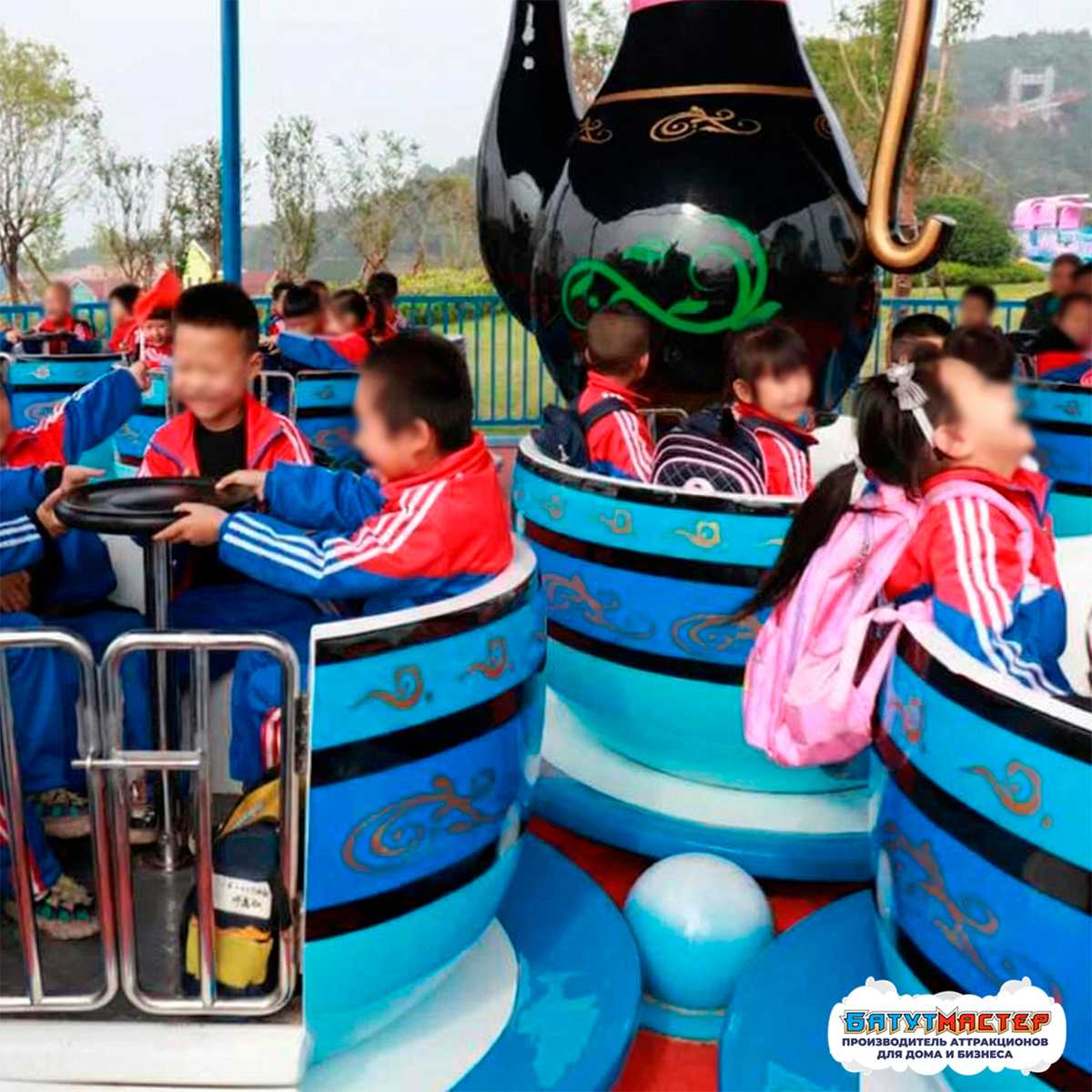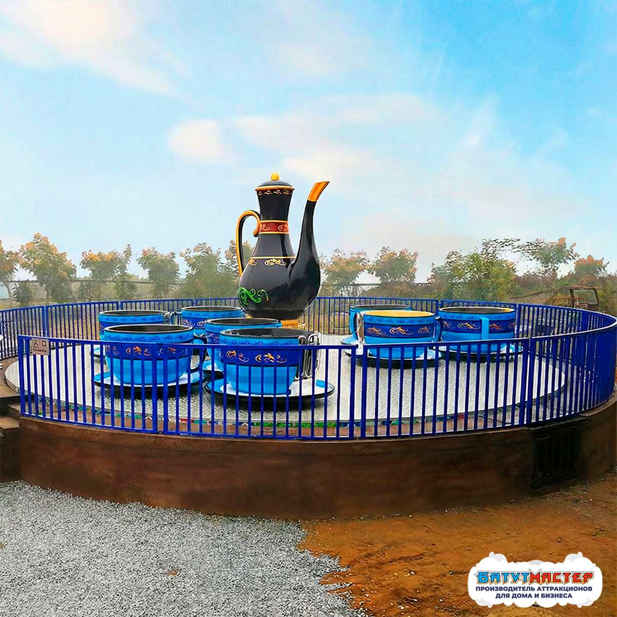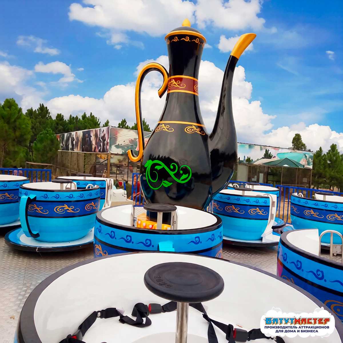 Аттракцион «Звездная ночь» — это не просто карусель, это полноценный арт-объект, создающий вокруг себя атмосферу восточной сказки. Центральный элемент — величественный декоративный чайник, напоминающий арабскую кувшин-джамбу, из которого, кажется, вот-вот появится джинн. Вокруг него — 8 ярких чашечек с восточным орнаментом, каждая из которых вмещает до двух человек. Вместимость — 16 человек, что делает аттракцион высокооборотным и выгодным для владельца.