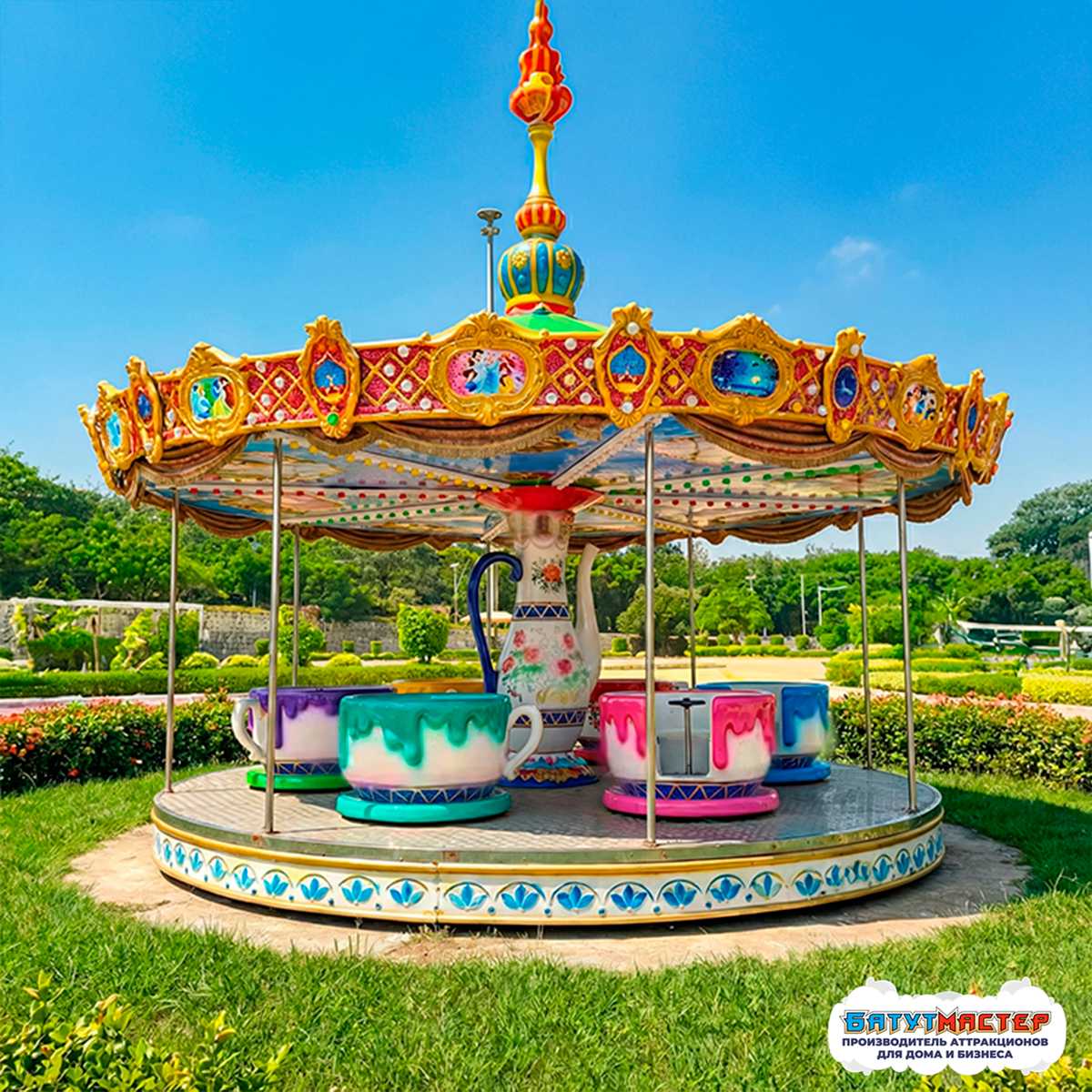 Аттракцион «Цветное настроение» — это классическая карусель в формате популярных «чашек», выполненная в яркой, сказочной стилистике. Он мгновенно привлекает внимание: декоративный чайник в центре, разноцветные чашки с эффектом «пролившейся глазури», резные узоры и купол с богатым оформлением создают ощущение волшебного чаепития из сказки. Аттракцион не только радует глаз, но и пробуждает воображение, погружая гостей в атмосферу настоящего праздника.