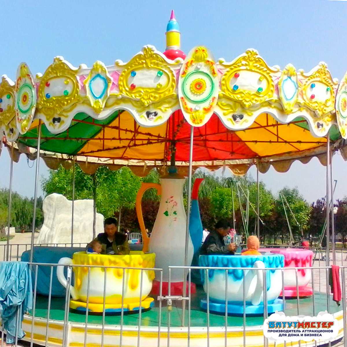 Двойное вращение — крутится сама платформа и каждая чашка по отдельности, что добавляет веселья и эмоций.