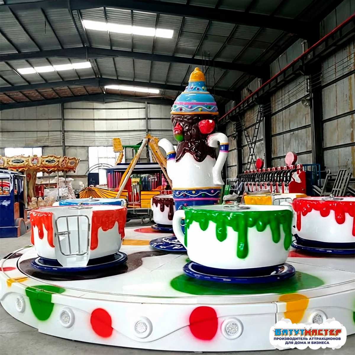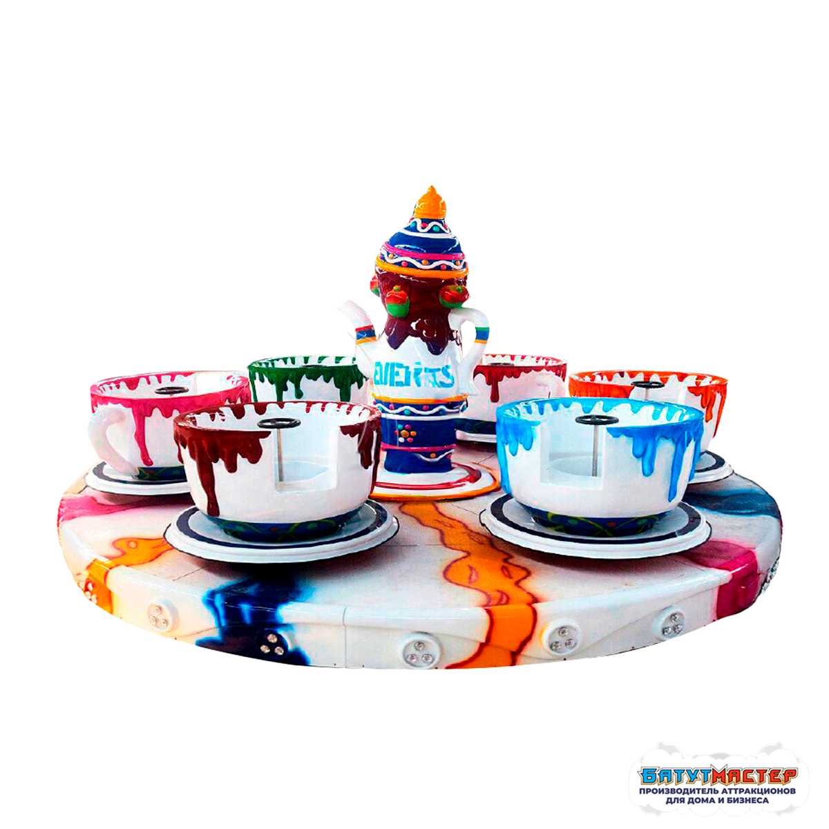 «Сладкая симфония» — это не просто аттракцион, а красочный праздник, где каждый визит превращается в увлекательное чаепитие на карусели! Оформление чашек будто бы взято из мультфильма: с яркими «стекающими» красками и гигантским чайником в центре, который словно приглашает гостей на весёлое кружение. Благодаря такому дизайну аттракцион не только развлекает, но и становится ярким акцентом любой площадки.