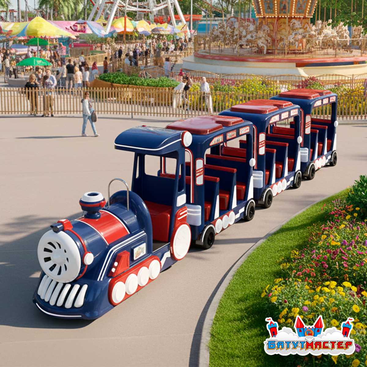 Говорят, что «Синий Жужжик» никогда не стоит без дела. Стоит ему появиться на площадке — и вокруг сразу собираются дети, родители, камеры смартфонов и радостный смех. Этот безрельсовый поезд создан в образе дружелюбного паровозика, который словно сошёл со страниц детской истории. Его округлые формы, насыщенный синий цвет и контрастные декоративные элементы формируют яркий визуальный образ, легко запоминающийся и ассоциирующийся с весельем и безопасным отдыхом.