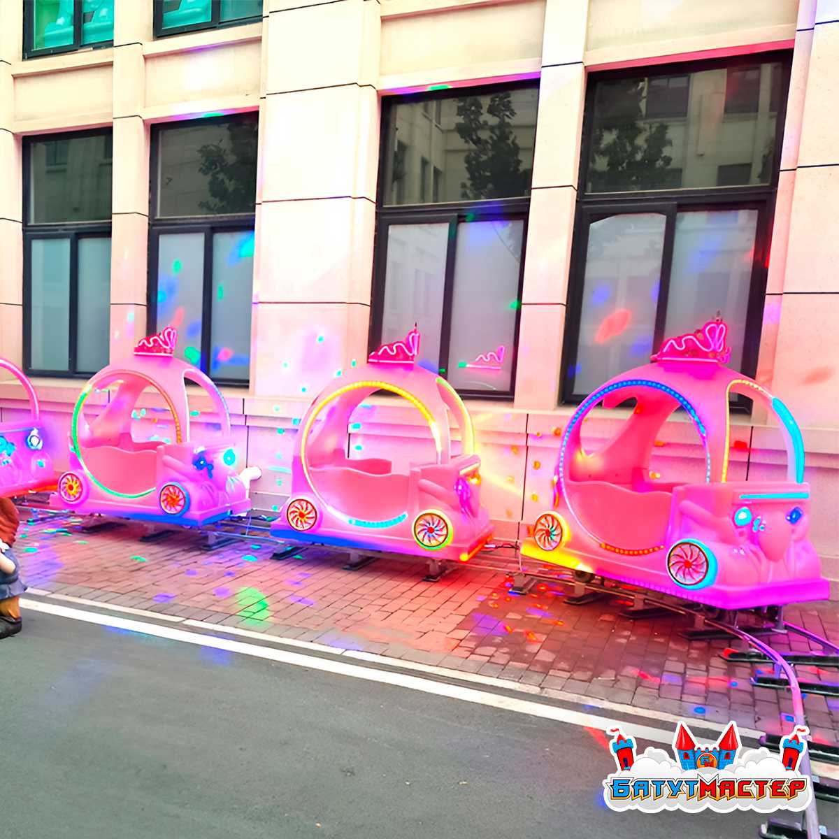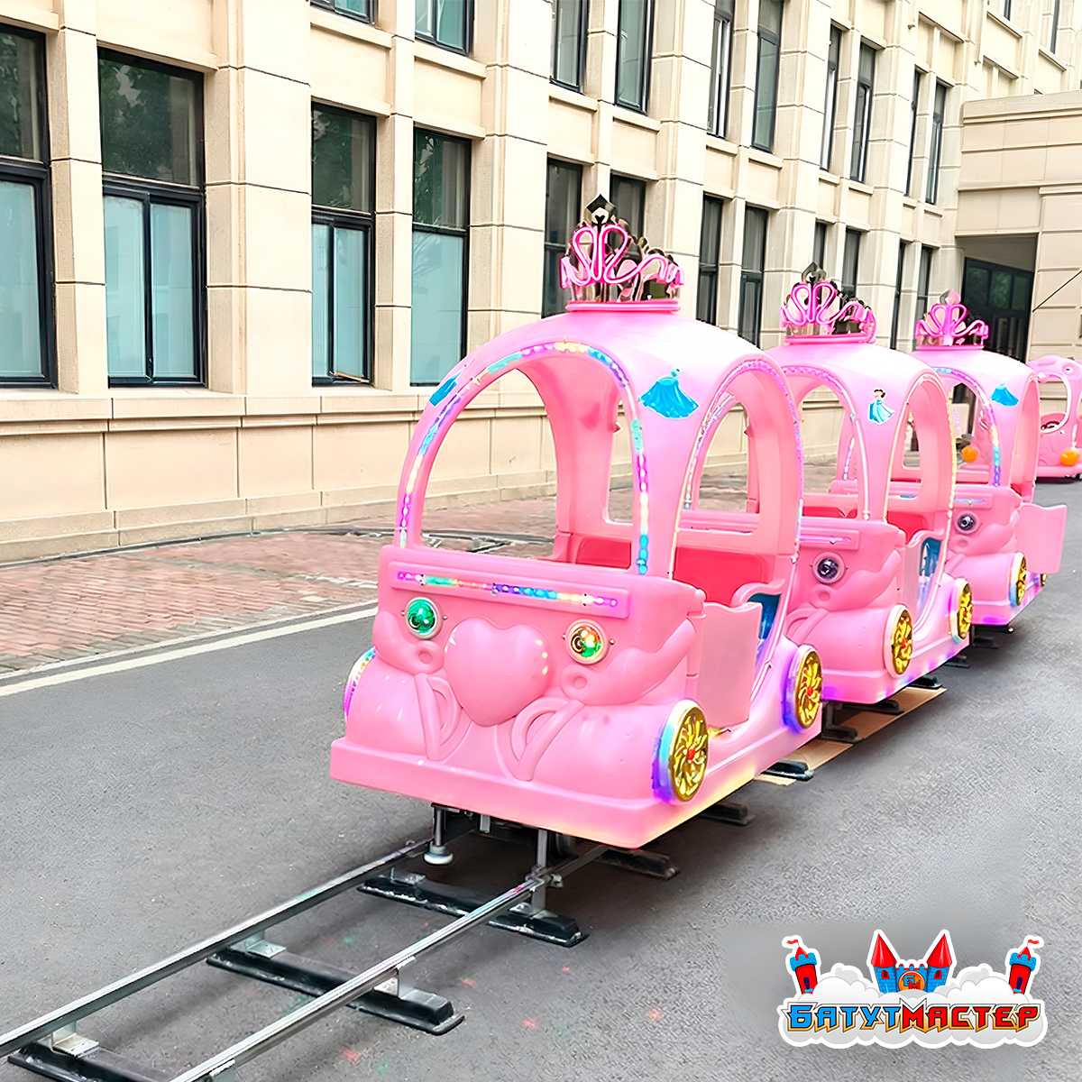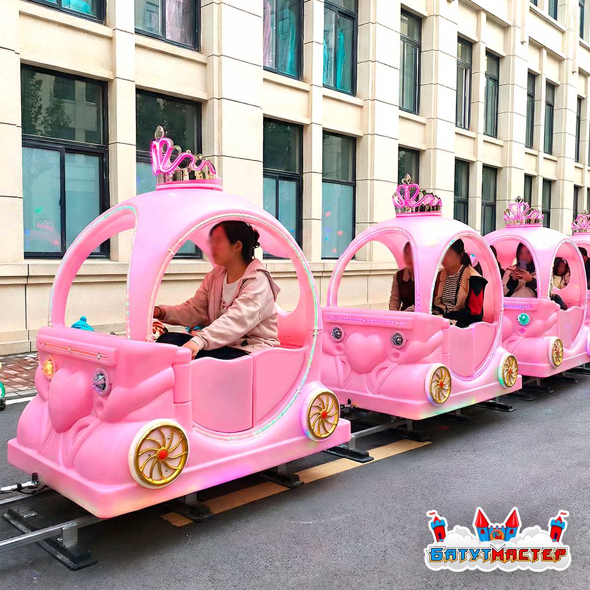 Аттракцион «Принцесса» — это не просто поезд, а воплощённая мечта маленьких принцесс. Каждый вагон стилизован под королевскую карету с декоративными коронами, яркими фарами-сердечками и позолоченными колёсами. Сверкающая LED-подсветка вдоль всей конструкции усиливает эффект сказочного волшебства, особенно в вечернее время.