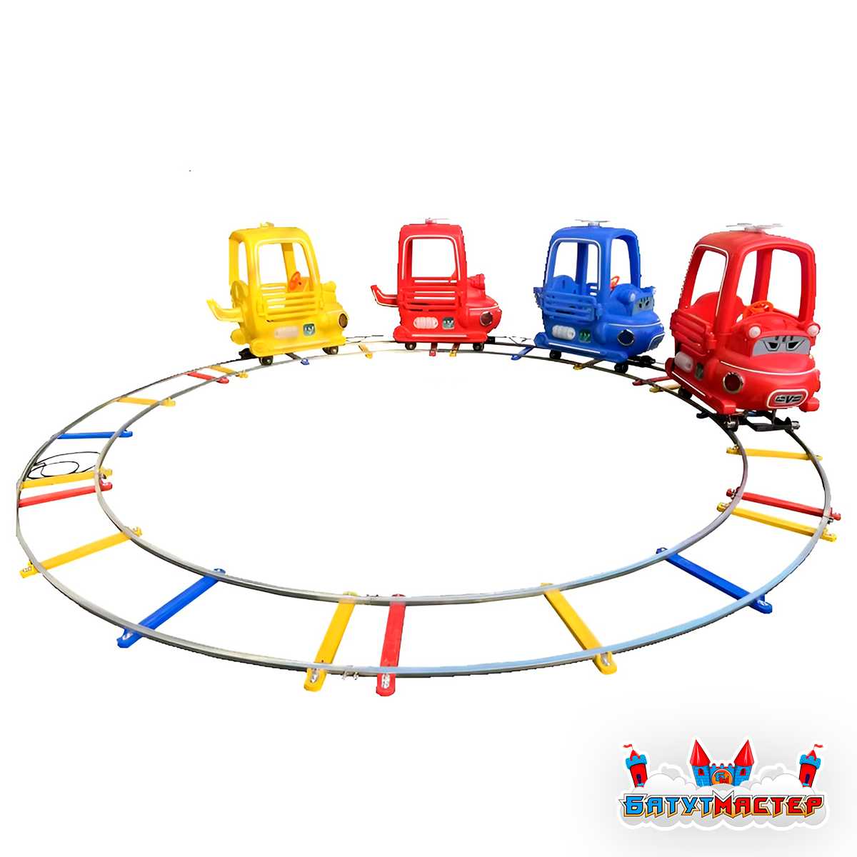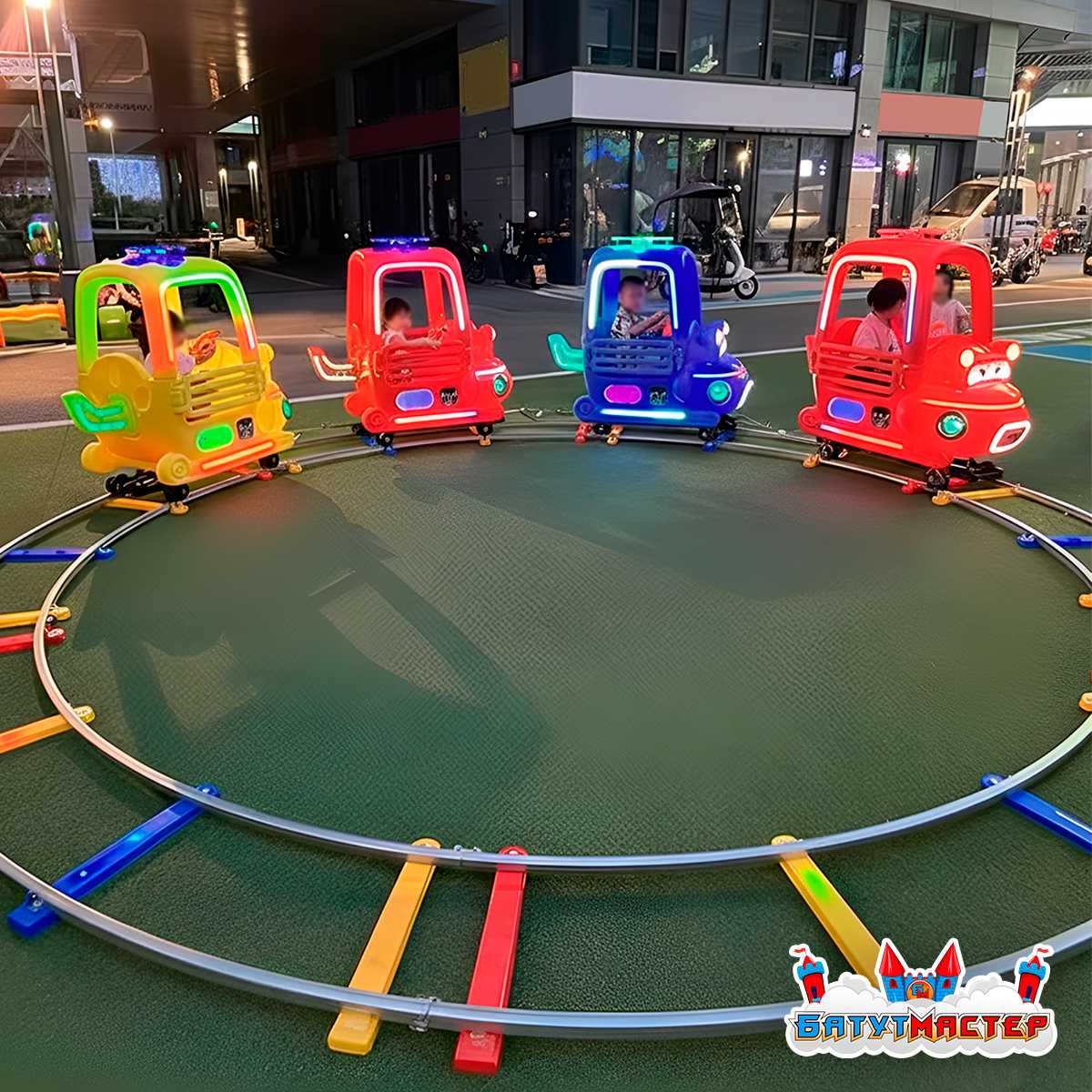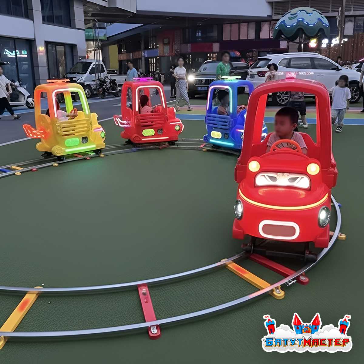 Аттракцион на рельсах «Светофорчик» с 4 машинками — это полноценное развлечение для детей в возрасте от 2 до 8 лет, оформленное в яркой мультяшной стилистике. Конструкция представляет собой круговой трек диаметром 3,5 метра, по которому движутся четыре пластмассовые машинки: красные, синие и жёлтые, каждая из которых выполнена в виде улыбающегося персонажа. Один из вагончиков даже украшен глазами, словно герой мультфильма — он сразу вызывает улыбку и интерес у малышей.