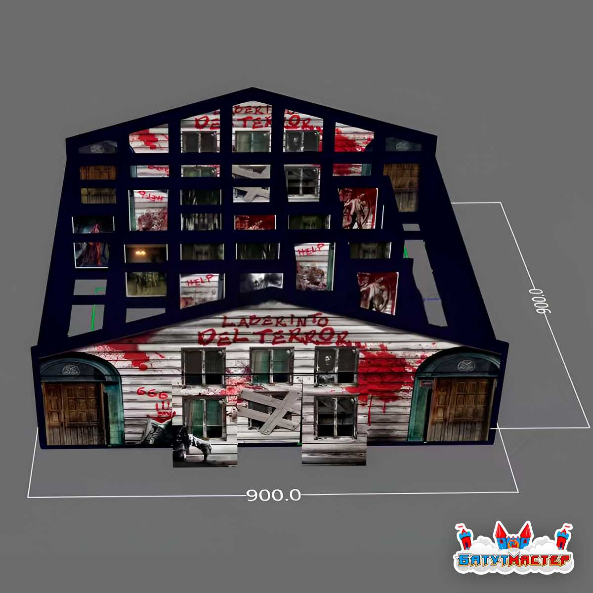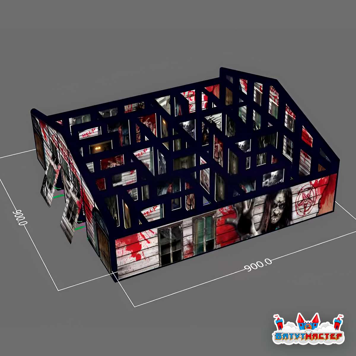 Размеры 9x9x3.5 м обеспечивают достаточное внутреннее пространство для комфортного прохождения квеста, с множеством поворотов, скрытых углов и развилок. Такая планировка создаёт запутанный маршрут, усиливая эффект неожиданности.