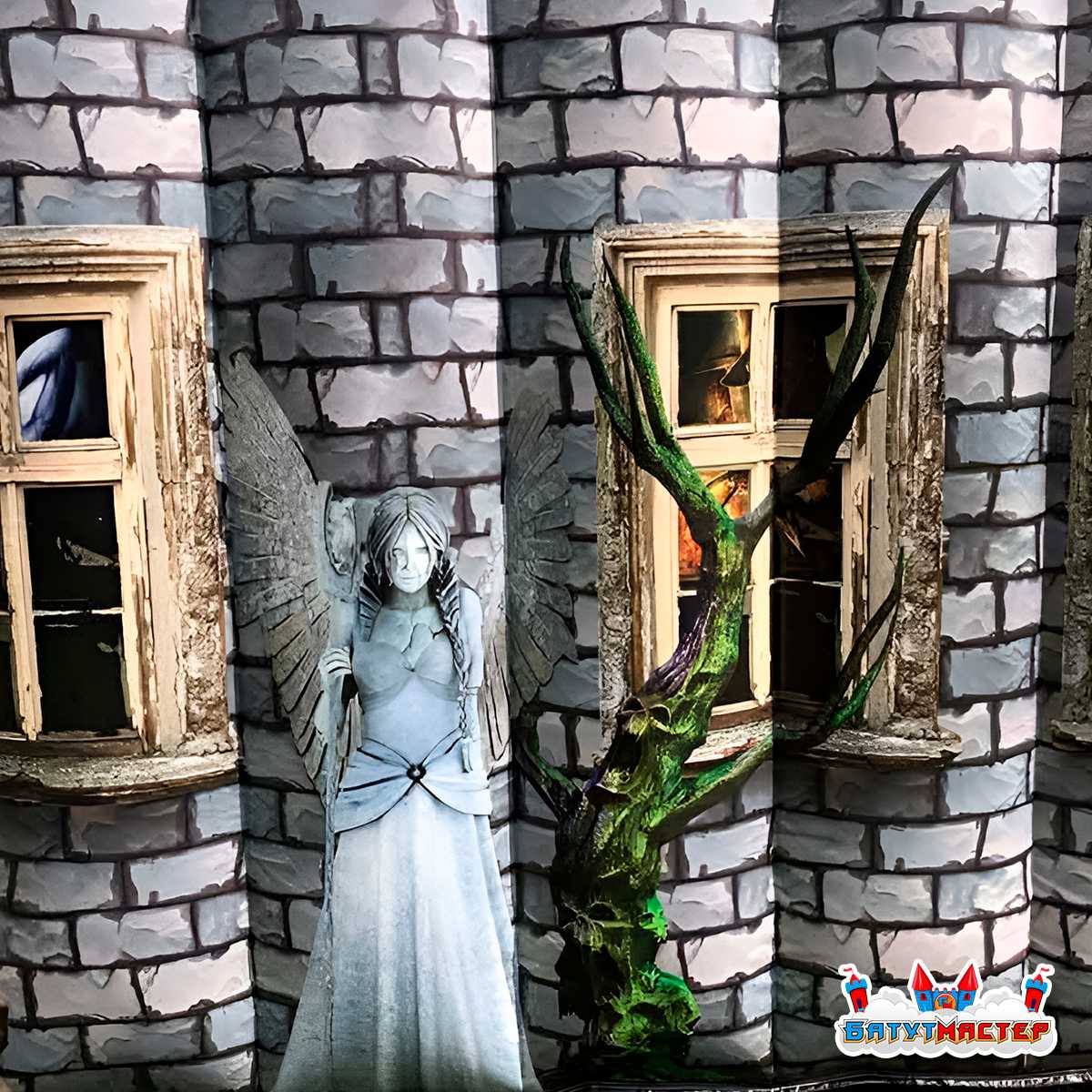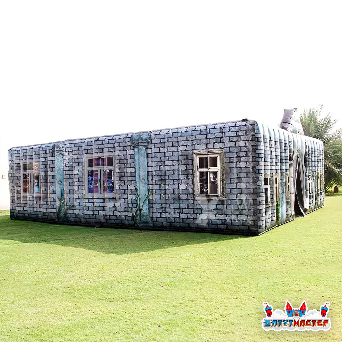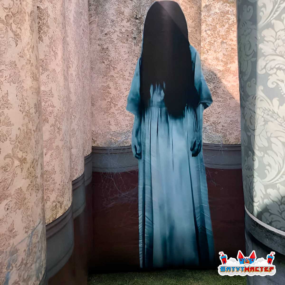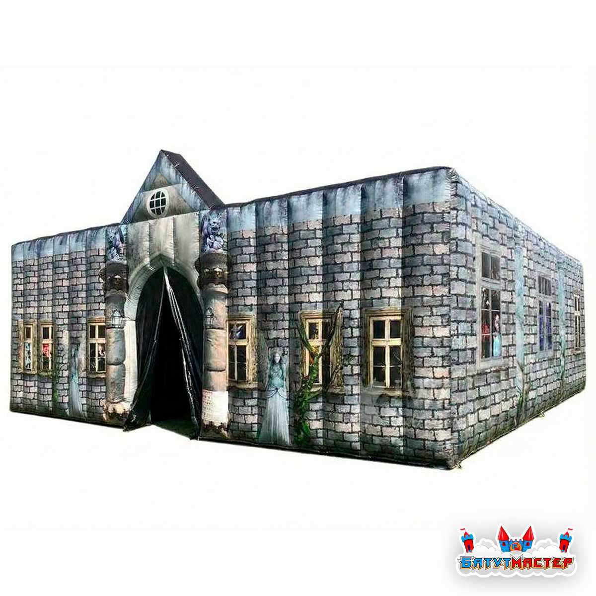 «Город призраков» — это масштабная надувная комната страха размером 10x10x4 м, стилизованная под старинное проклятое здание. Снаружи конструкция выполнена в виде кирпичного мрачного дома с окнами, из которых выглядывают загадочные фигуры. На входе гостей встречает арочный портал, за которым скрываются извилистые коридоры, тусклый свет, жуткие тени и образы, внезапно появляющиеся в полумраке.