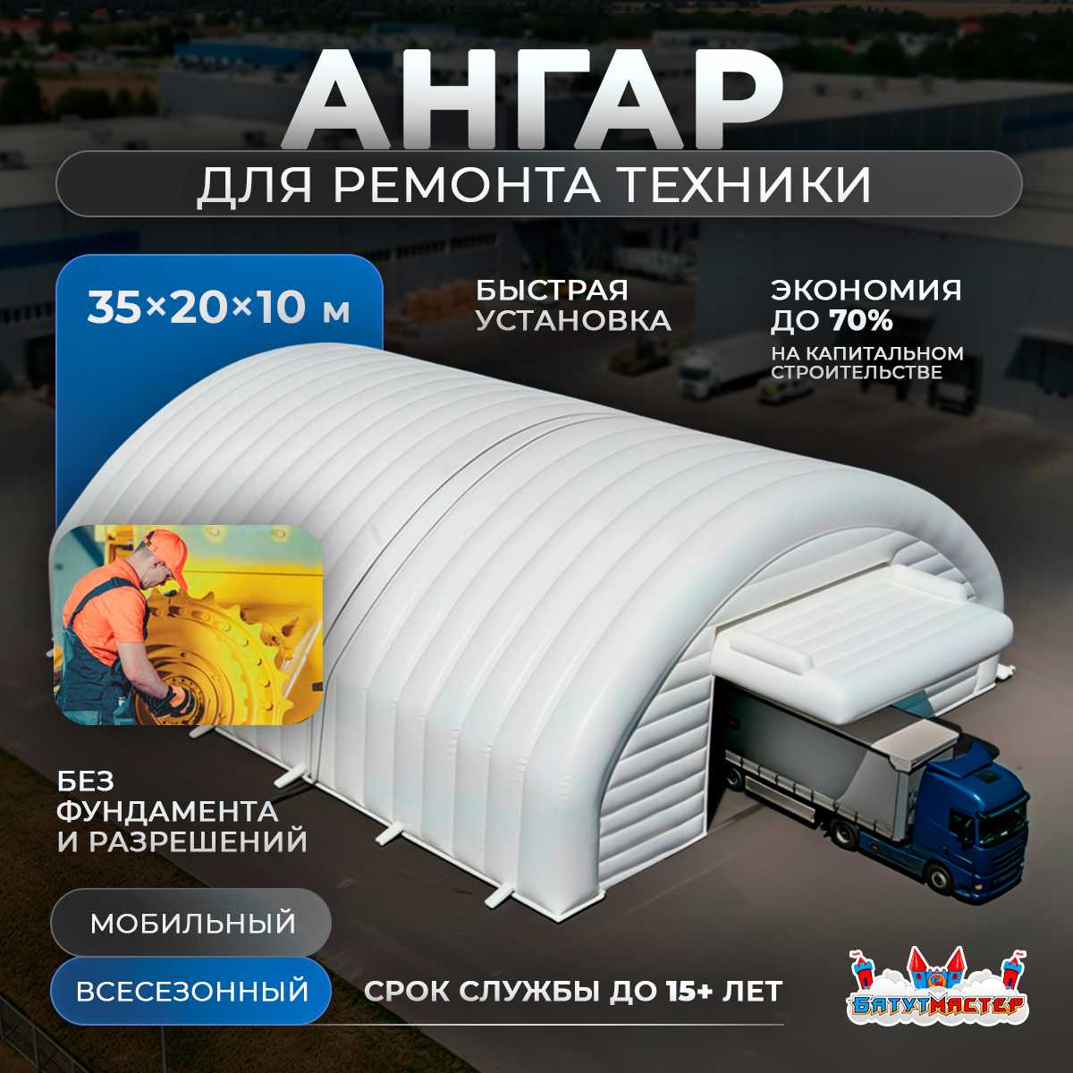 Пневмокаркасный ангар «ТехСервис» 35×20×10 м — это современное решение для бизнеса, нуждающегося в быстром, надёжном и всесезонном укрытии для ремонта, обслуживания и хранения техники.