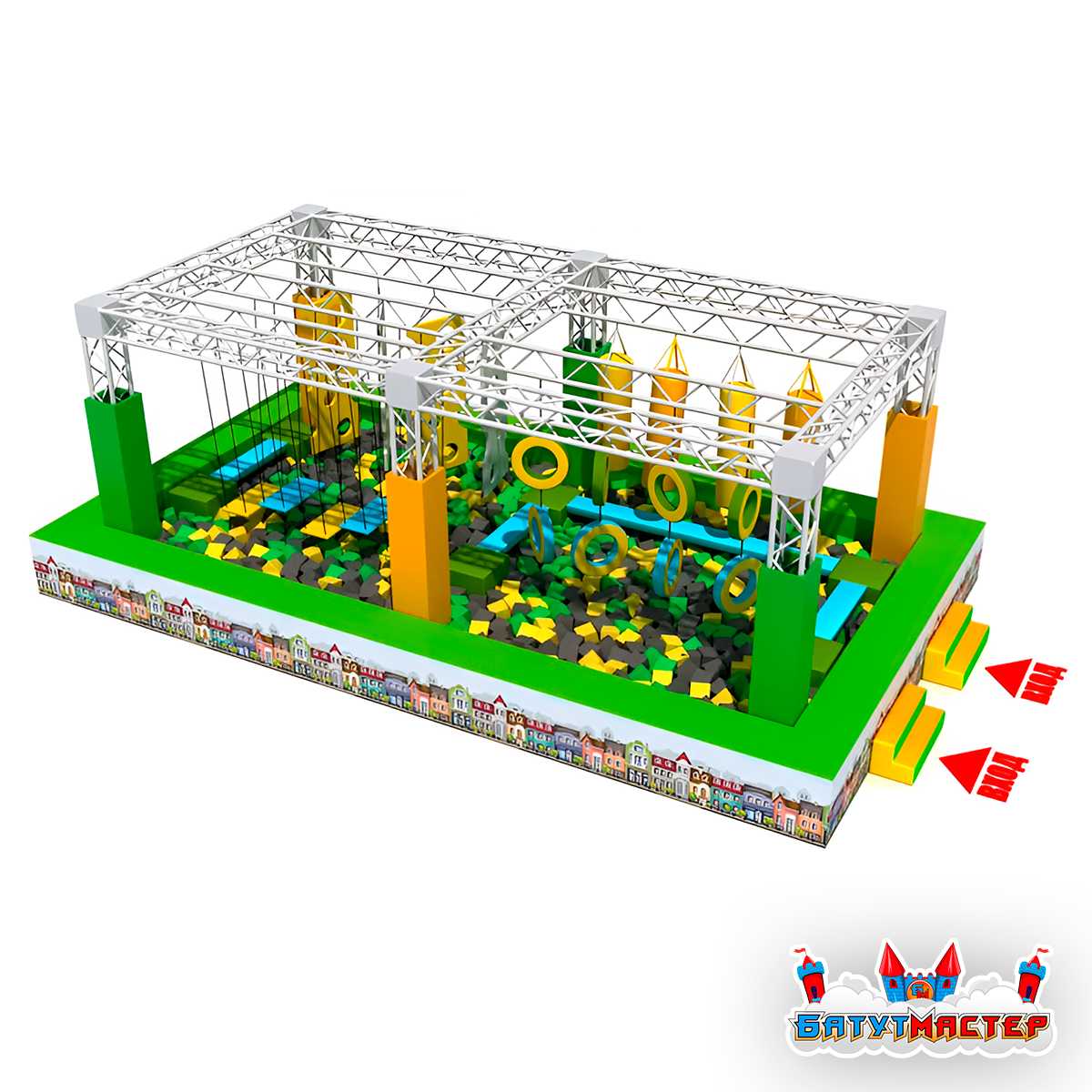 • Используются мягкие покрытия и поролоновая яма для безопасного приземления.