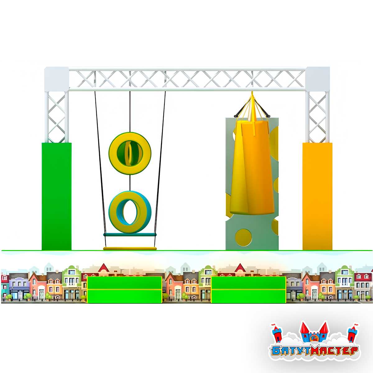 Платформа создана на прочном металлическом каркасе с подвесными снарядами, кольцами, балансировочными элементами и мягкой зоной приземления. Такая конструкция обеспечивает полный контроль риска, позволяя участникам сосредоточиться на процессе прохождения и получать удовольствие от движения.