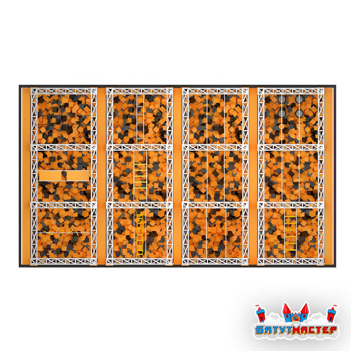 Конструкция выполнена на прочном металлическом каркасе, что обеспечивает высокую устойчивость при интенсивной эксплуатации. Пространство под трассой заполнено мягкими поролоновыми кубами, создающими дополнительный уровень амортизации и безопасности. Такой формат делает прохождение препятствий комфортным даже для начинающих спортсменов и детей младшего возраста.