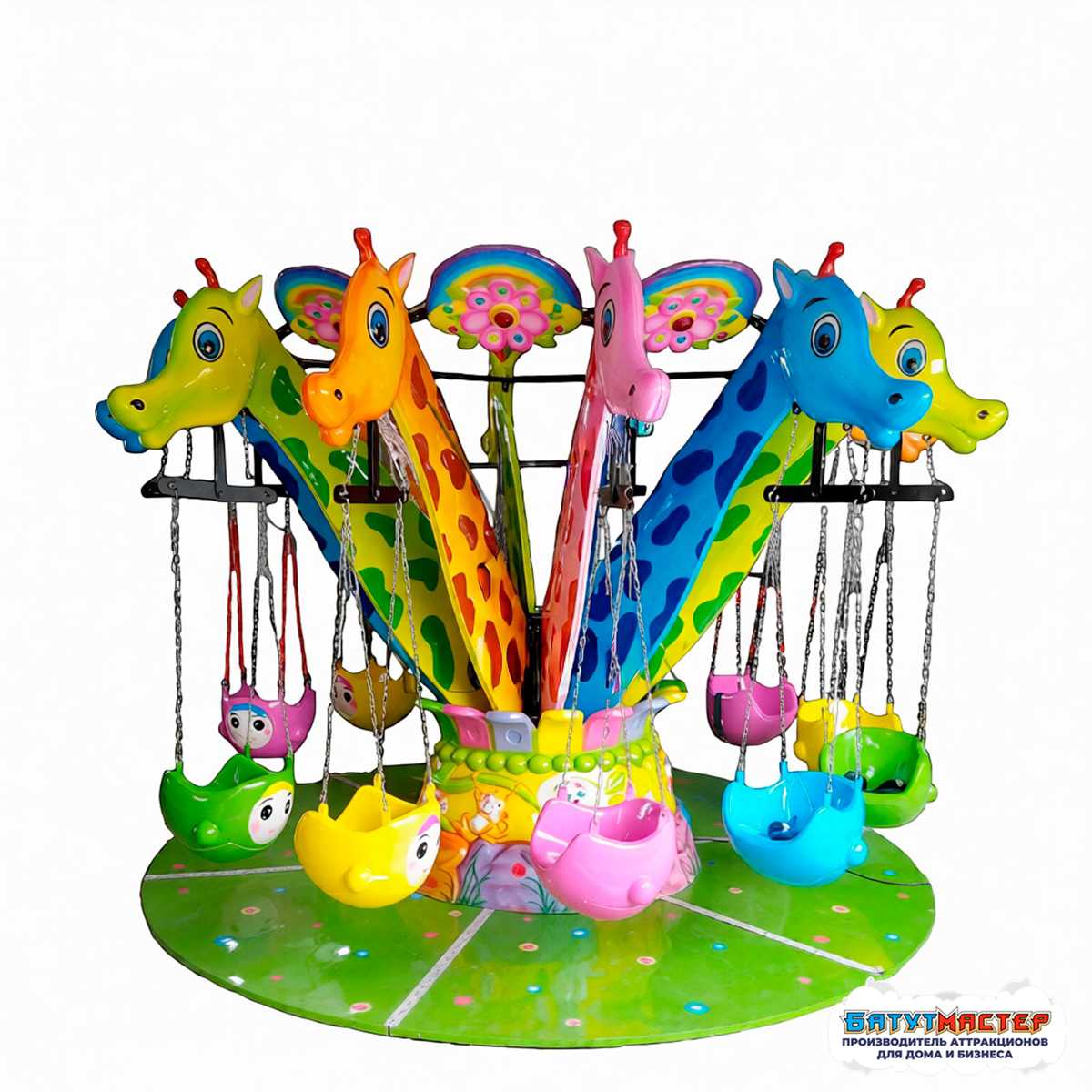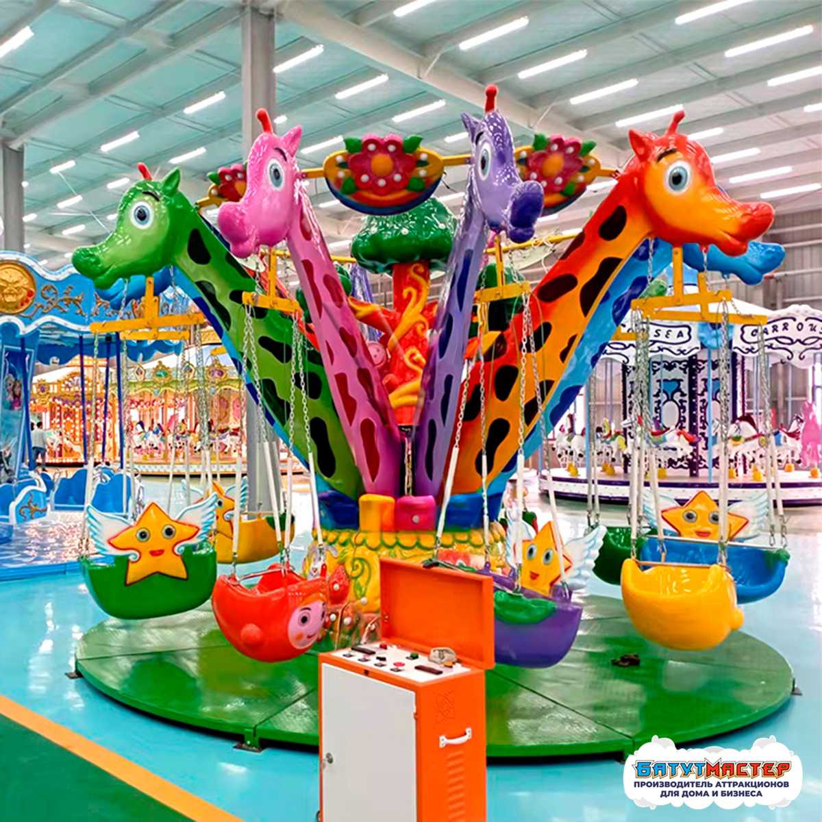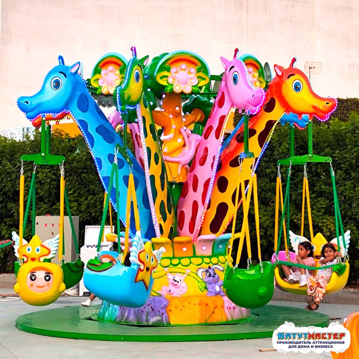 Подвесная карусель «Воздушная мечта» создаёт магию с первых секунд — её красочная композиция и плавное движение сидений погружают маленьких гостей в атмосферу добра, веселья и сказочного полёта. Аттракцион работает как магнит: яркие цвета, выразительные жирафики и лёгкая динамика привлекают внимание сразу, ещё до момента запуска.