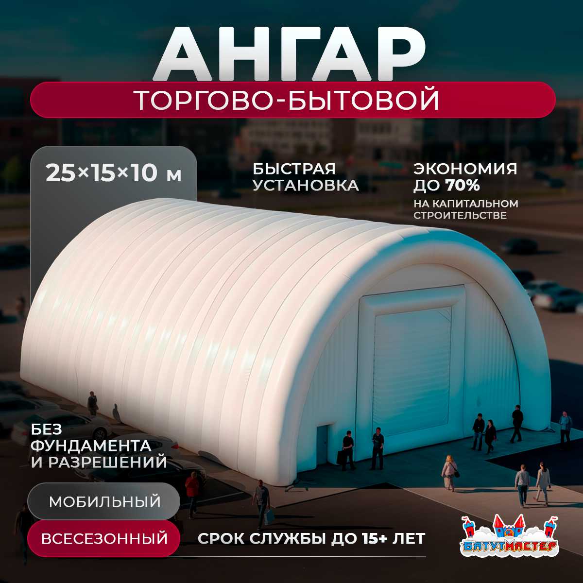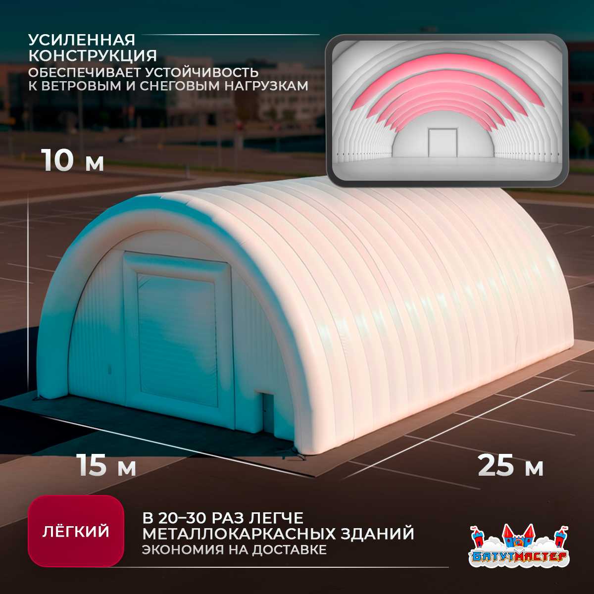 Пневмоангар «ТрейдЦентр» 25x15x10 м создан как современная альтернатива капитальным торговым зданиям. Он формирует комфортную среду для покупателей и сотрудников, обеспечивая защищённое и стабильное пространство, которое можно использовать круглый год. Арочные надувные конструкции из ПВХ давно зарекомендовали себя как надёжные, экономичные и практичные решения для активного бизнеса, которому необходим быстрый запуск коммерческого объекта в любом месте.