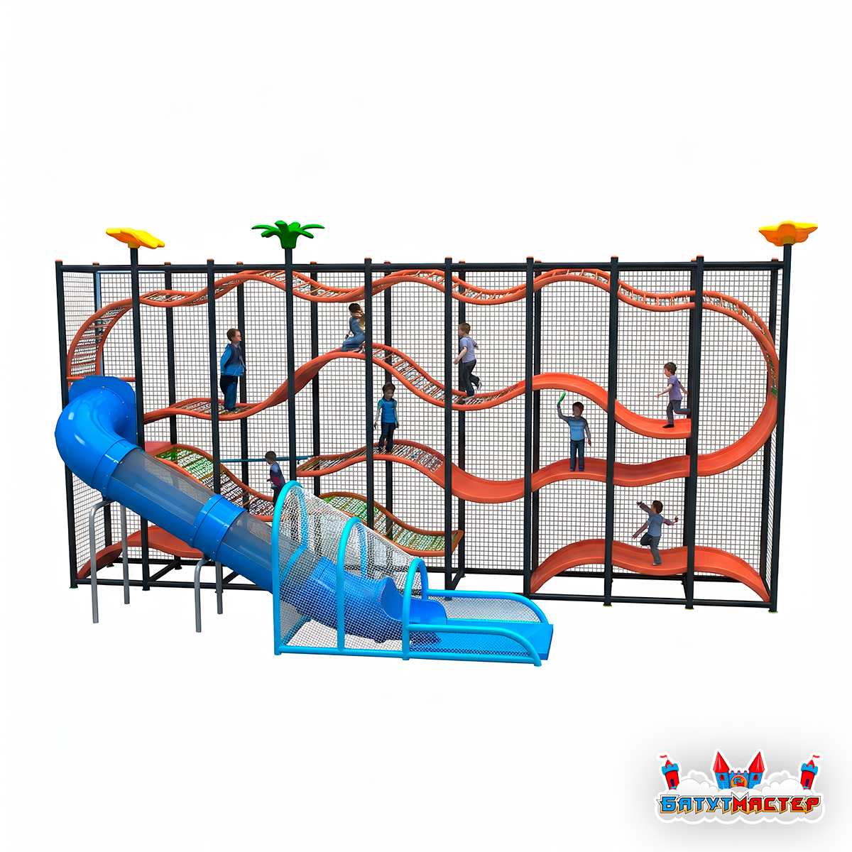 «Веселые Горки»— это современный плоский игровой лабиринт, созданный специально для помещений, где важны компактность, выразительный дизайн и функциональность. Волнообразные уровни формируют впечатляющий визуальный эффект и одновременно дают детям возможность активно передвигаться по маршрутам разной сложности. Конструкция оптимизирована для возрастной аудитории 3–12 лет: малыши комфортно перемещаются по нижним уровням, а дети постарше выбирают более активные высотные зоны и стремительные спуски.