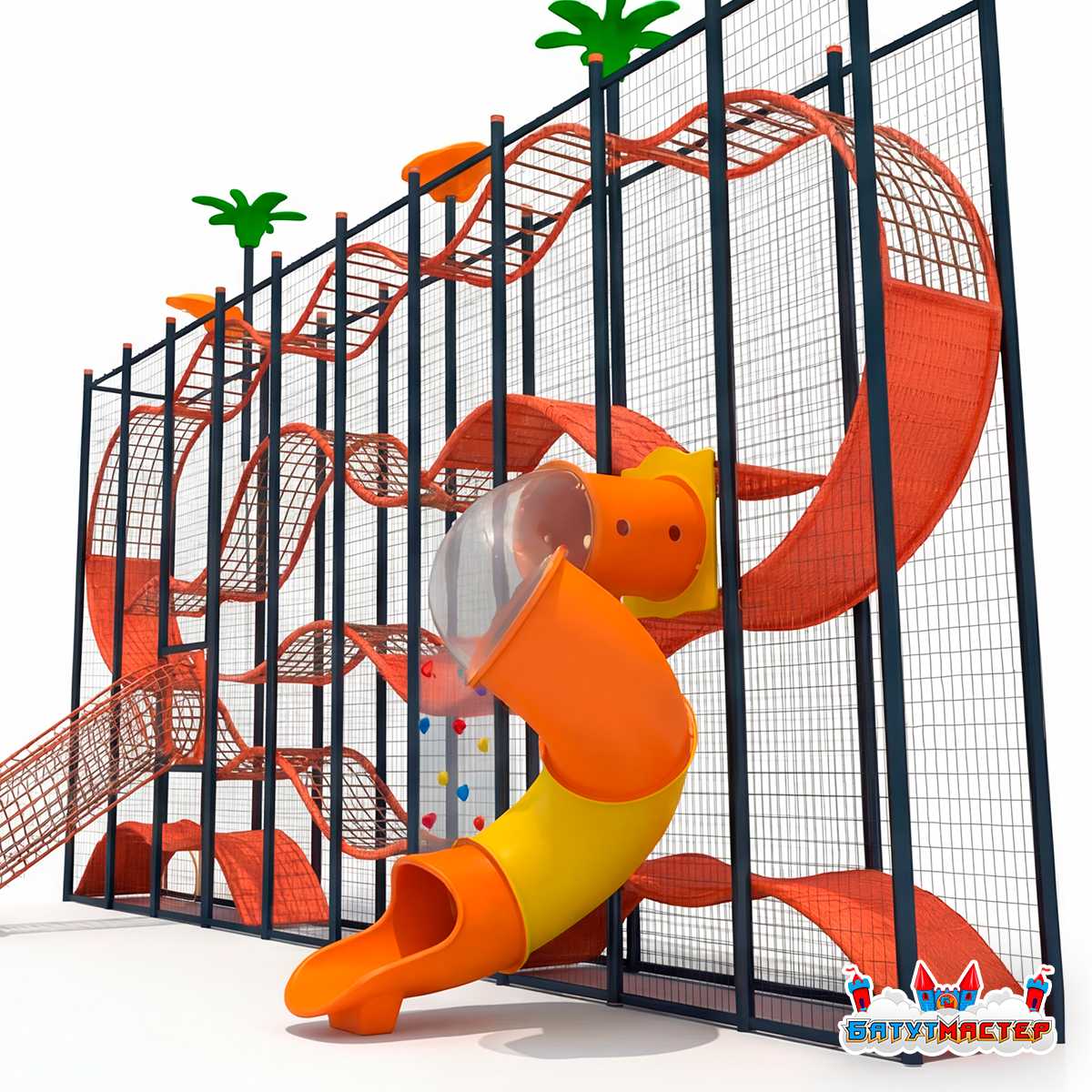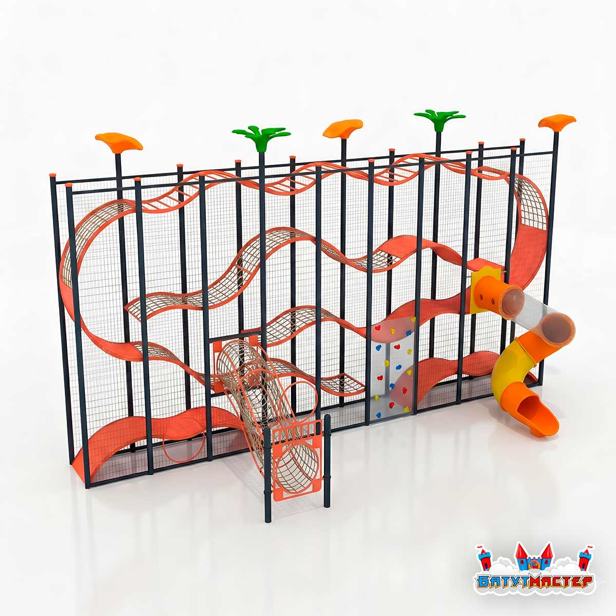 Каркас изготавливается из прочных материалов, устойчивых к ежедневным нагрузкам. Мягкие элементы и защитные поверхности обеспечивают комфорт и безопасность, а сетчатые ограждения позволяют родителям видеть ребёнка на протяжении всего маршрута. Все элементы конструкции легко очищаются и выдерживают интенсивное использование в местах с высокой посещаемостью.