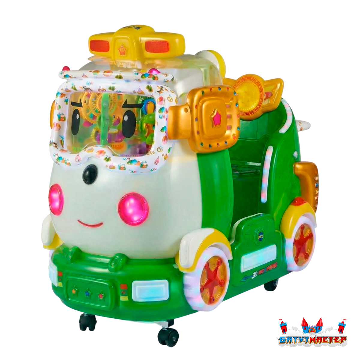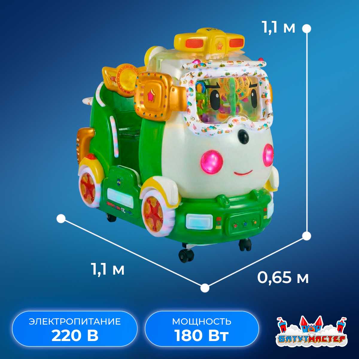 «Мятный Мобиль» — это современный мини-аттракцион для детей младшего возраста, объединяющий динамичное движение, полноценную LED-подсветку и эффектную интерактивную кабину.