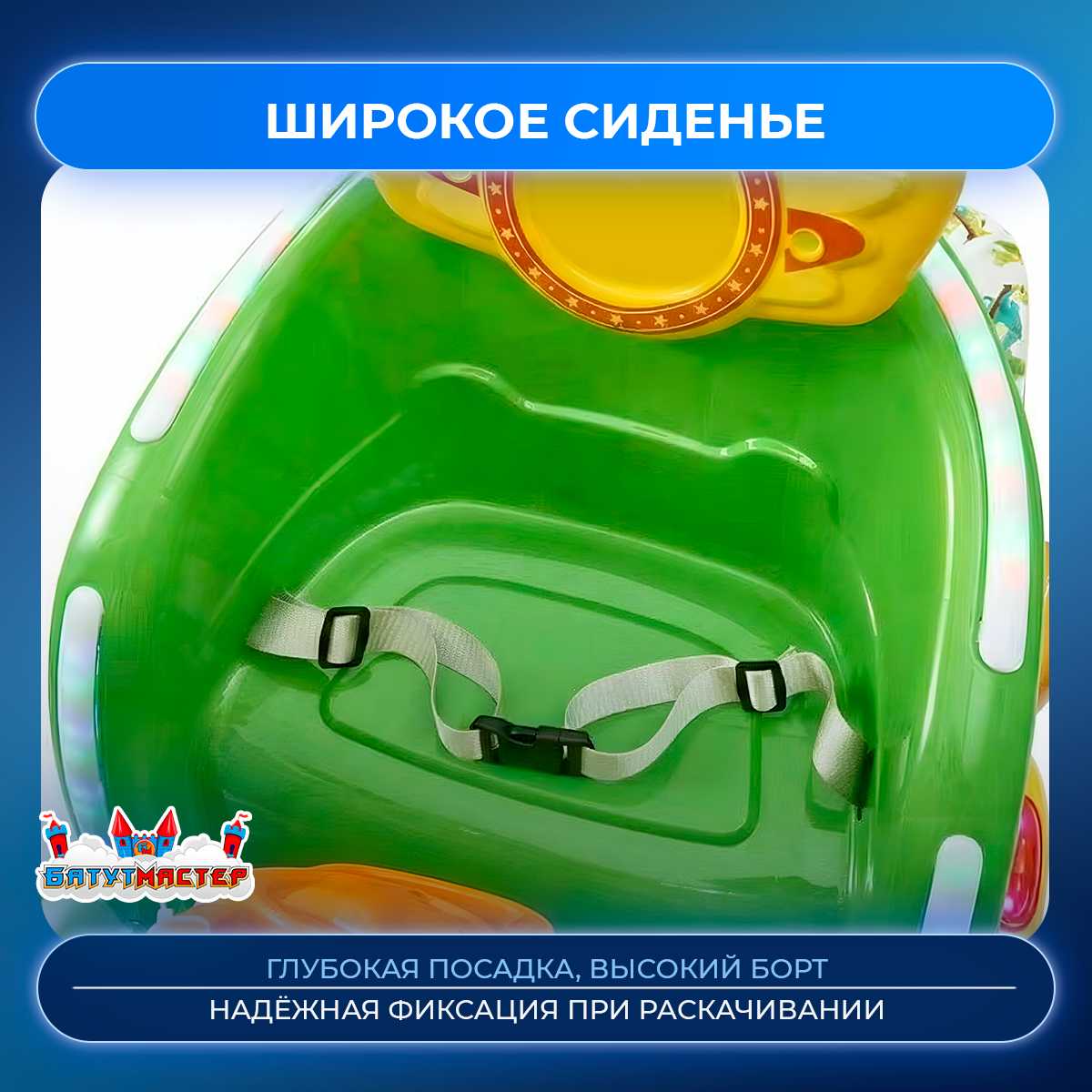 - Комфорт и безопасность — глубокое сиденье с бортиками и ремнём удерживает ребёнка при раскачивании.
