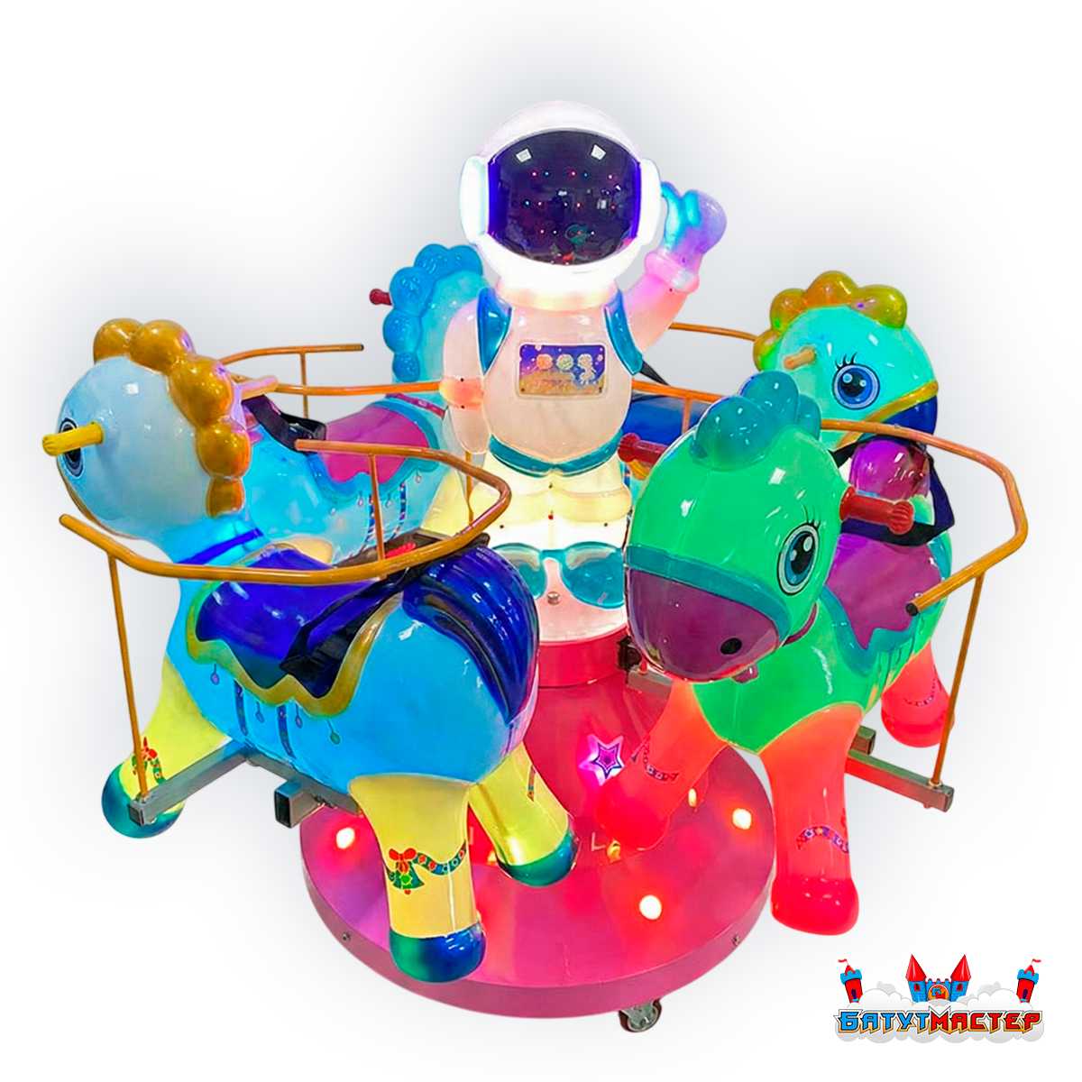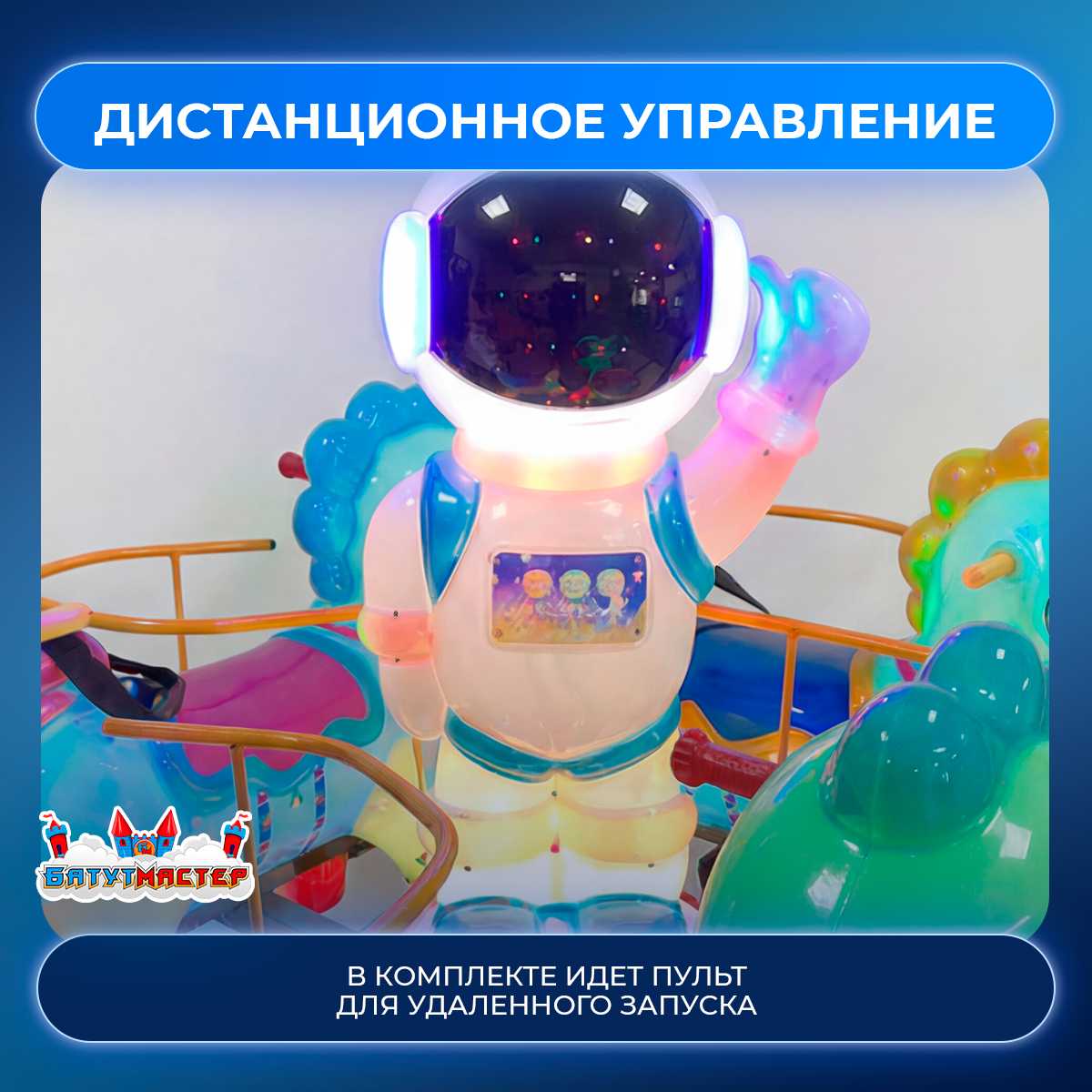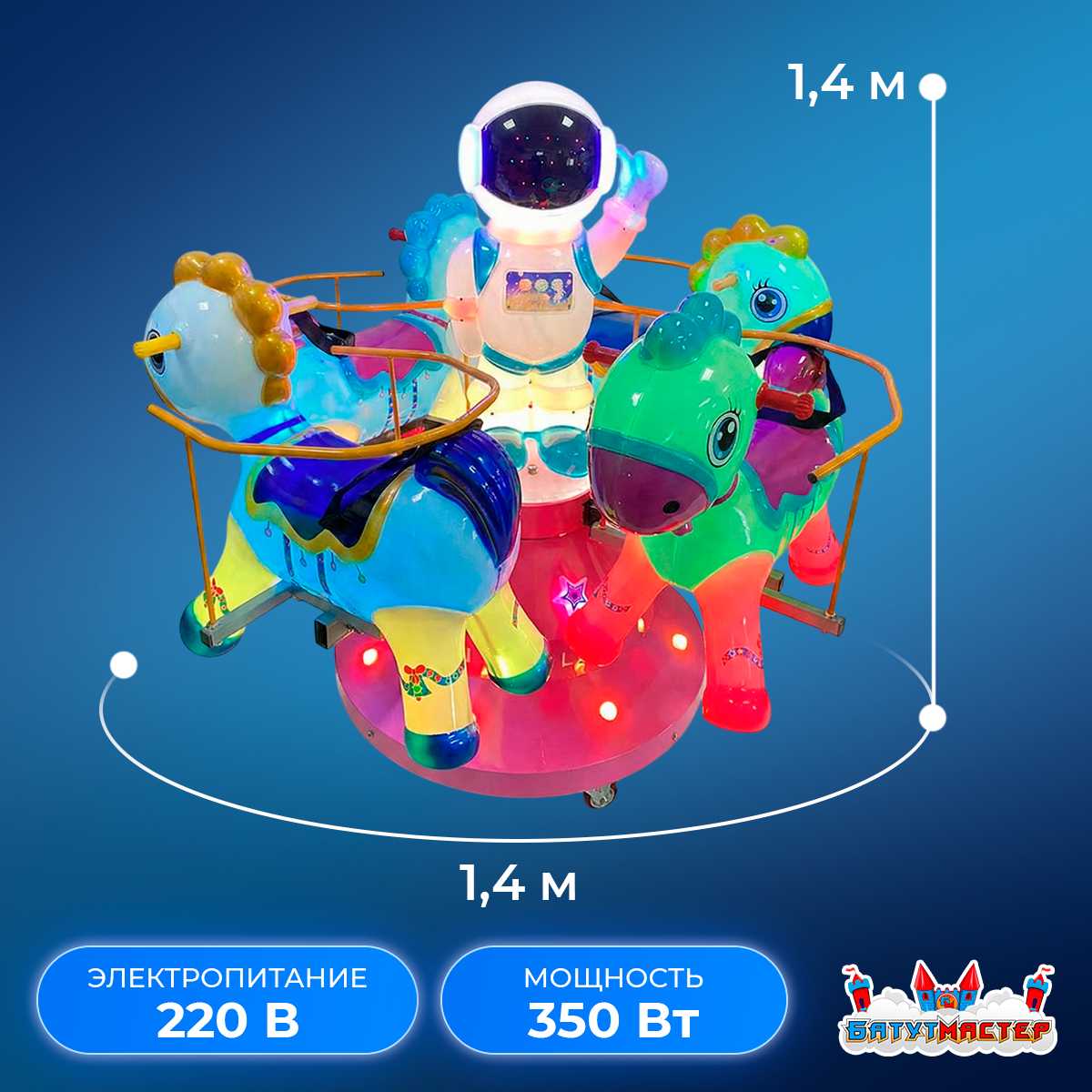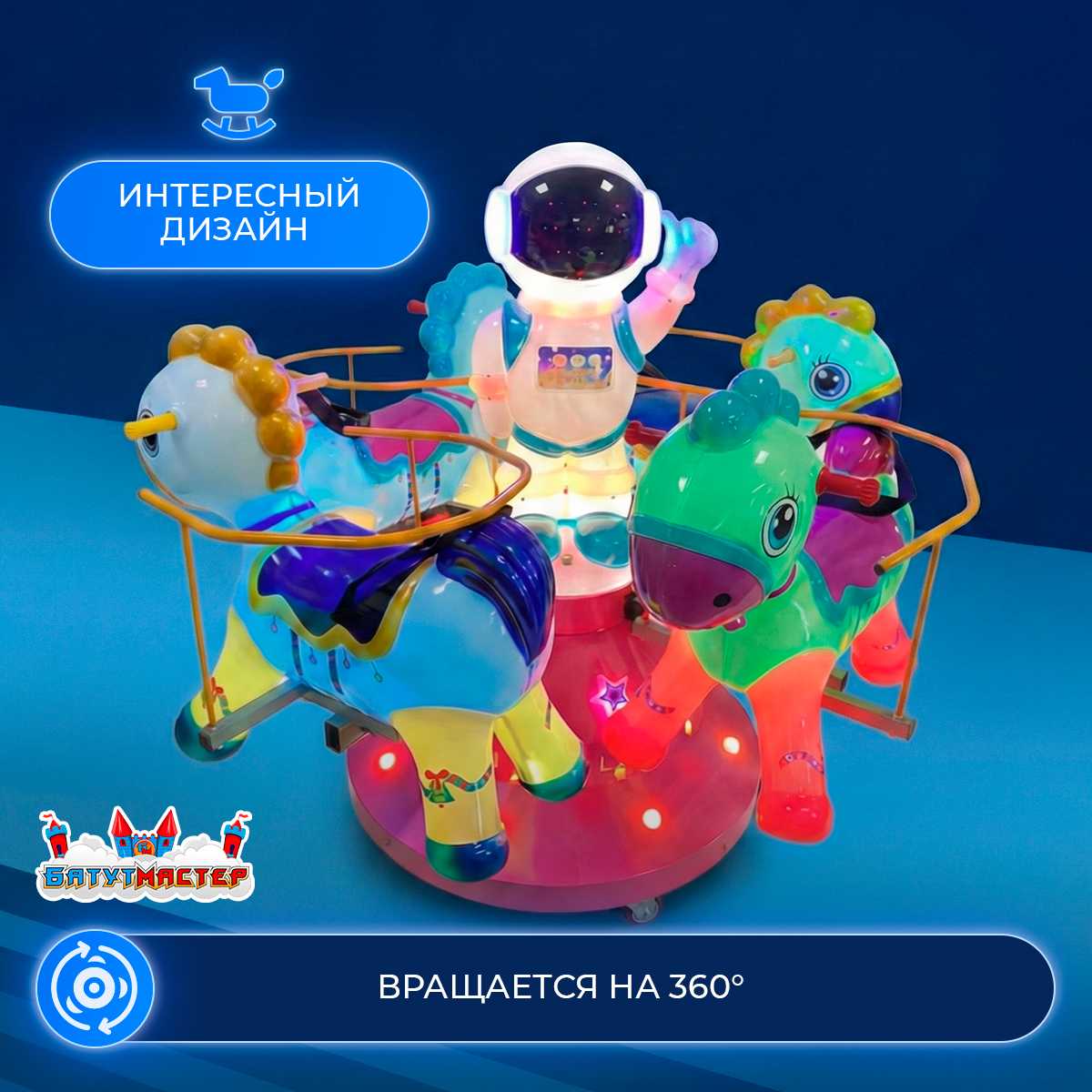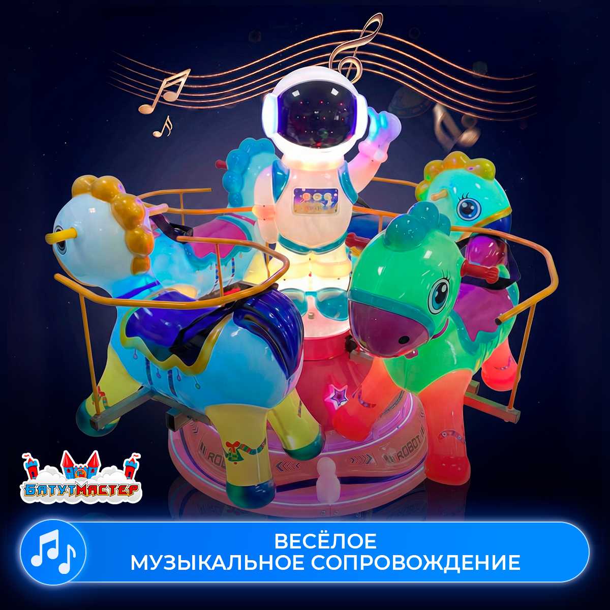 Дети мгновенно обращают внимание на сияющие лошадки, плавно меняющийся цвет подсветки и фигуру космонавта в центре — всё это создаёт атмосферу настоящего приключения.
