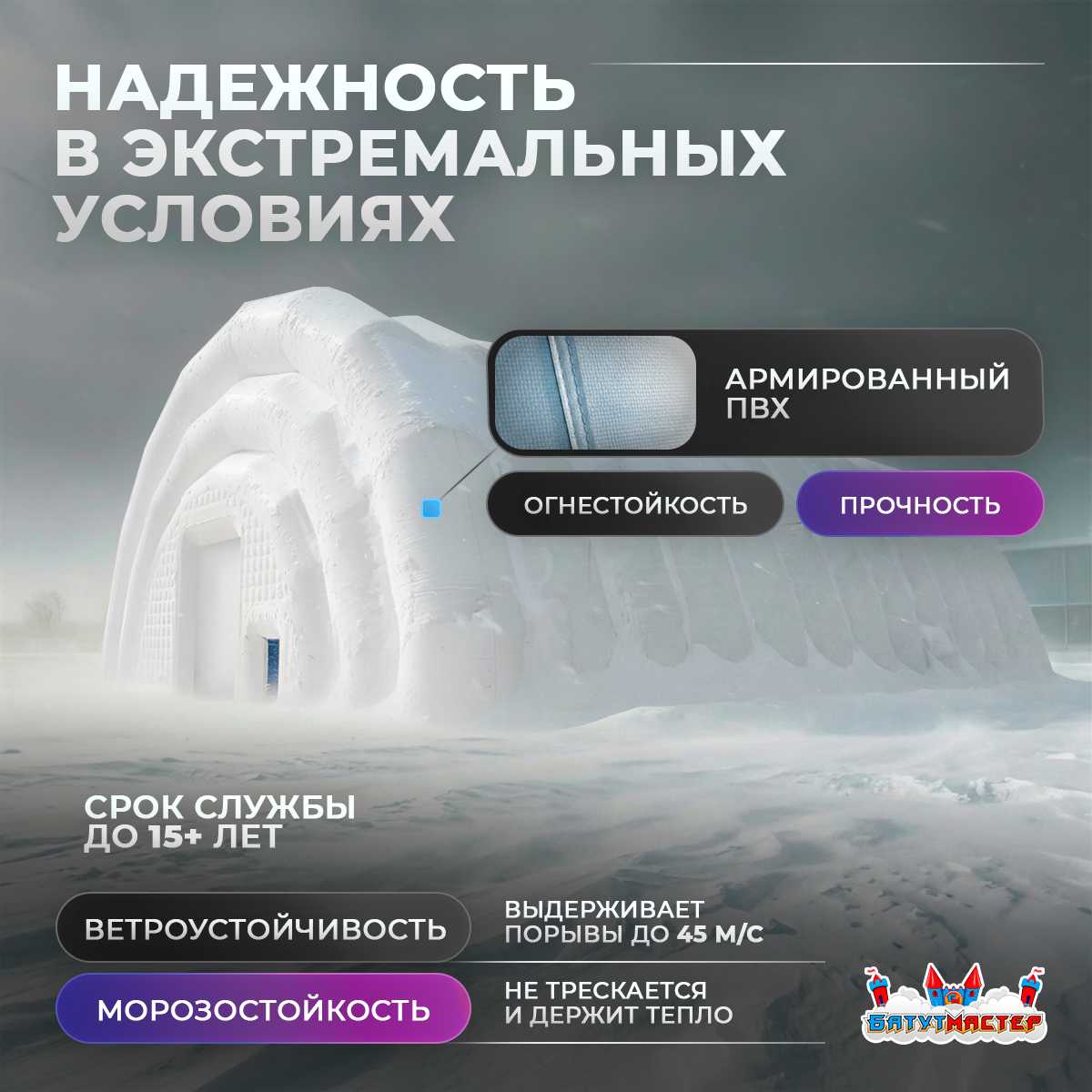 Армированный ПВХ демонстрирует высокую прочность и стойкость к низким температурам, не растрескивается и хорошо удерживает тепло, что особенно важно для мероприятий в холодное время года.