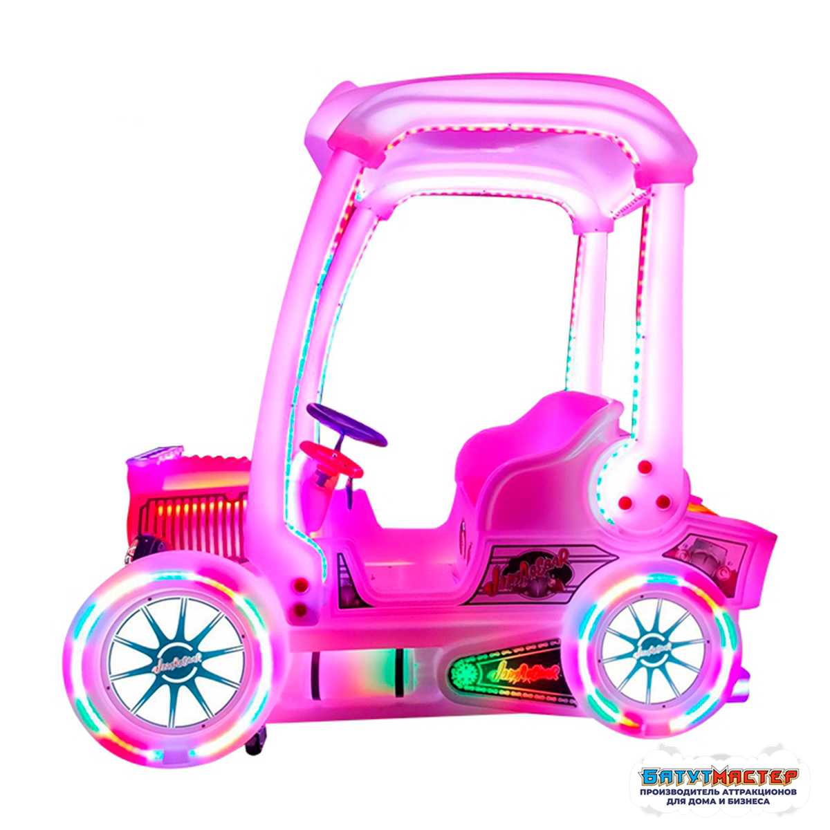 Приятный на вид корпус дополнен выразительными декоративными элементами, создающими ощущение настоящего ретро-автомобиля. Прочная крыша защищает пассажиров от яркого солнца, а панорамное оформление усиливает эффект «мини-транспорта для семейных поездок». LED-подсветка по периметру корпуса создаёт запоминающийся визуальный стиль и становится важным маркетинговым инструментом.