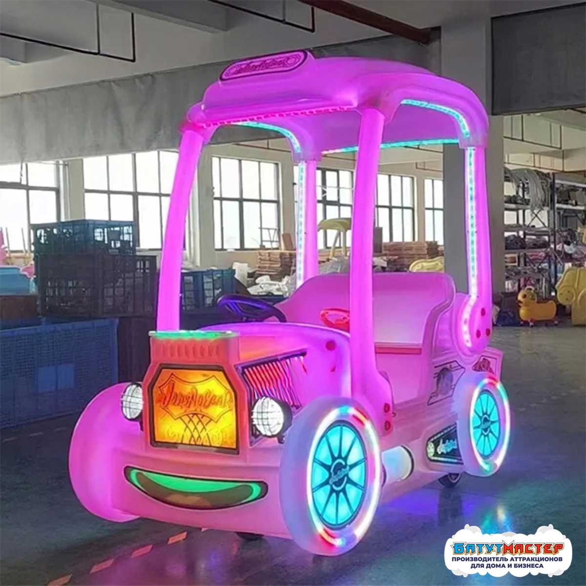 Парковый электромобиль «Ретро-кабриолет» выделяется среди аналогов благодаря сочетанию визуальной привлекательности, комфорта и надёжности. Его розовый мгновенно вызывает интерес у детей и родителей, а яркая многоцветная подсветка делает модель центральным элементом любой площадки.