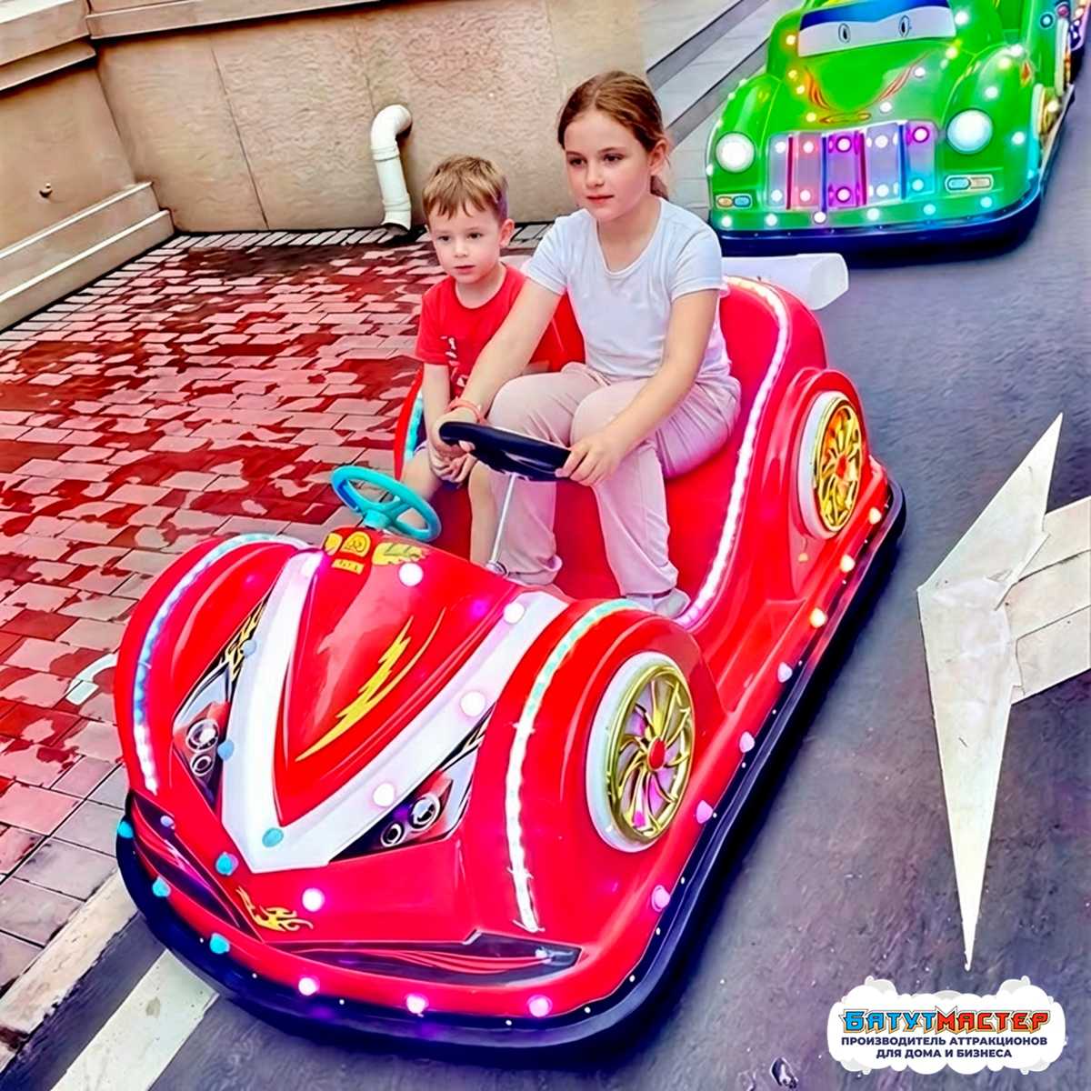 Двухместная конфигурация значительно расширяет целевую аудиторию: машина подходит как для самостоятельного катания детей, так и для семейных заездов «родитель + ребенок». Этот формат увеличивает количество клиентов и делает аттракцион универсальным для разных возрастов.