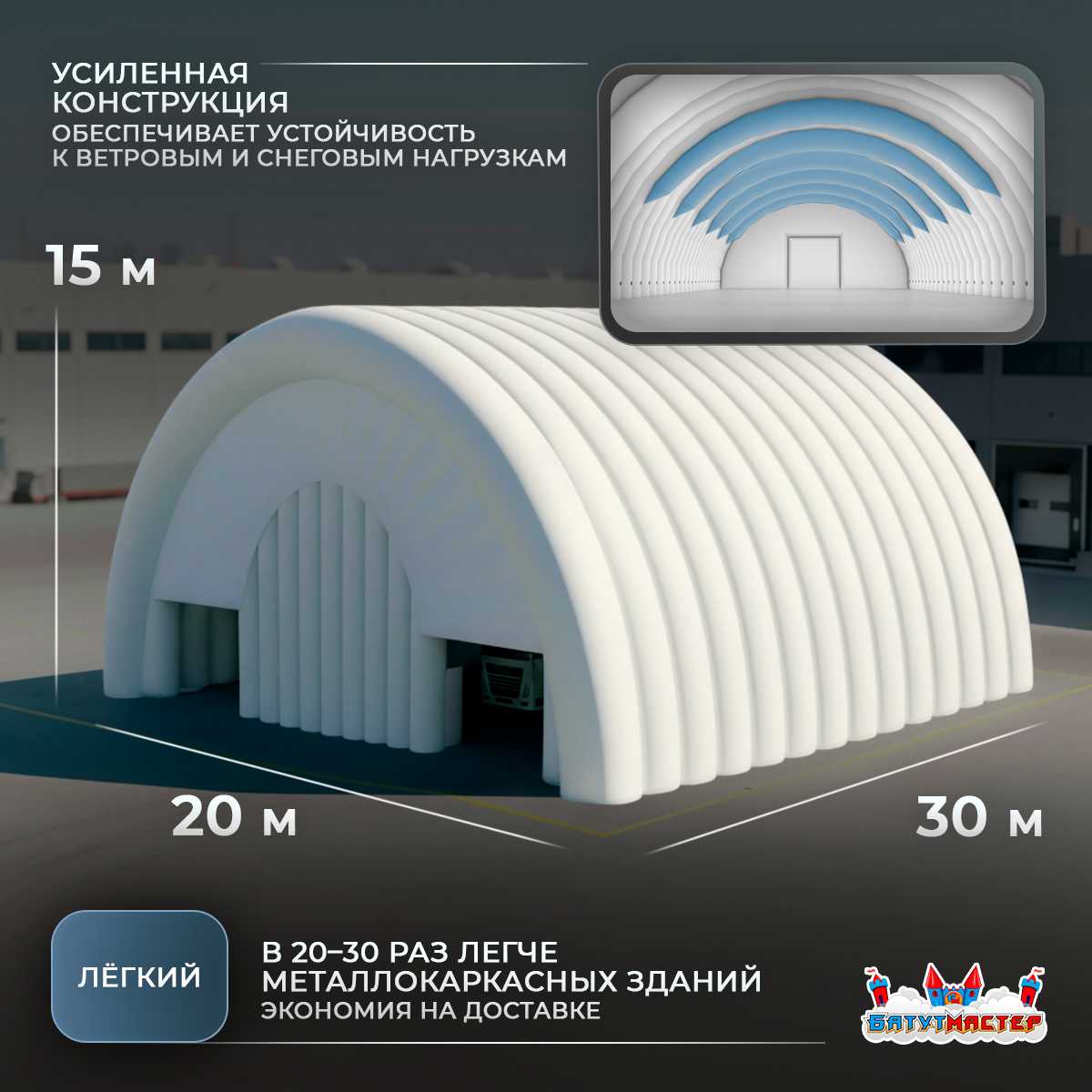 Использование герметичного пневмокаркаса позволяет поддерживать форму за счёт периодической подкачки без необходимости постоянной работы воздуходувного оборудования. Это делает ангар надёжным, простым в эксплуатации и экономически выгодным на длительном сроке использования.