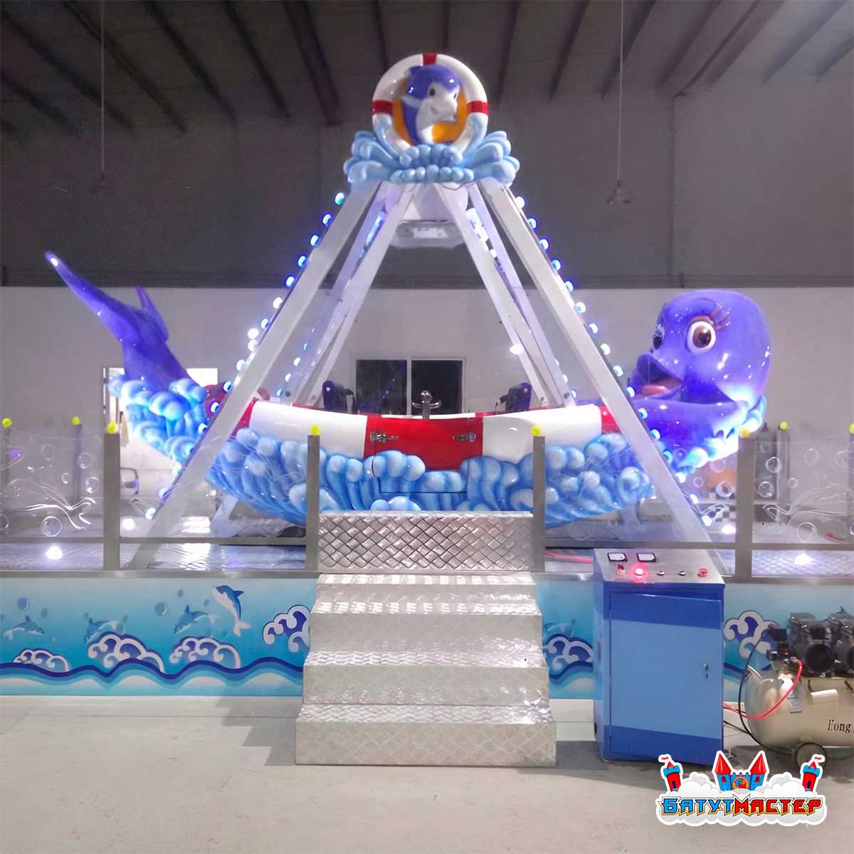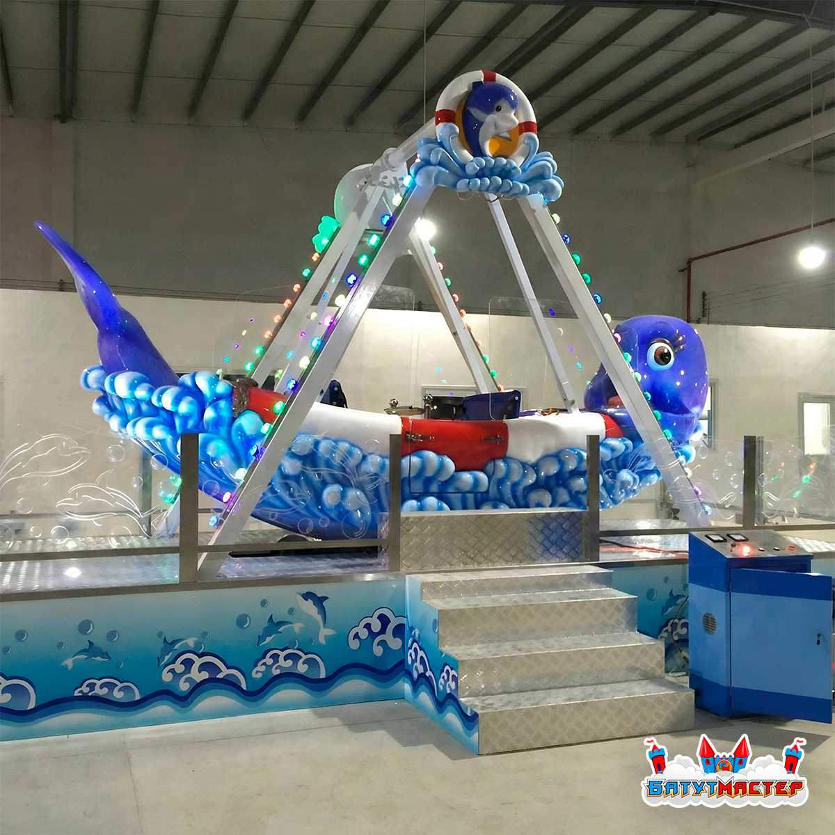 Дизайн аттракциона изготавливается в яркой морской тематике. Каждый элемент — от волн до веселых дельфинов — создает атмосферу настоящего морского приключения. Аттракцион украшен светодиодной подсветкой, что делает его особенно привлекательным в вечернее время. Использование морских символов и фигур, таких как дельфины, делает аттракцион ярким и заметным для гостей, создавая атмосферу веселья и праздника. На базе аттракциона можно выбирать различные декоративные элементы в зависимости от желаемой тематики, что дает возможность настроить его под особенности парка, торгового центра или ярмарки.