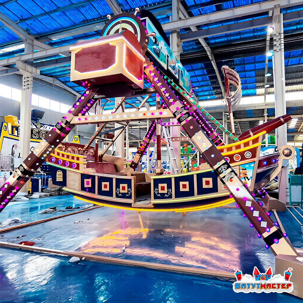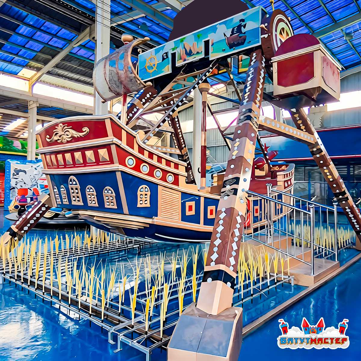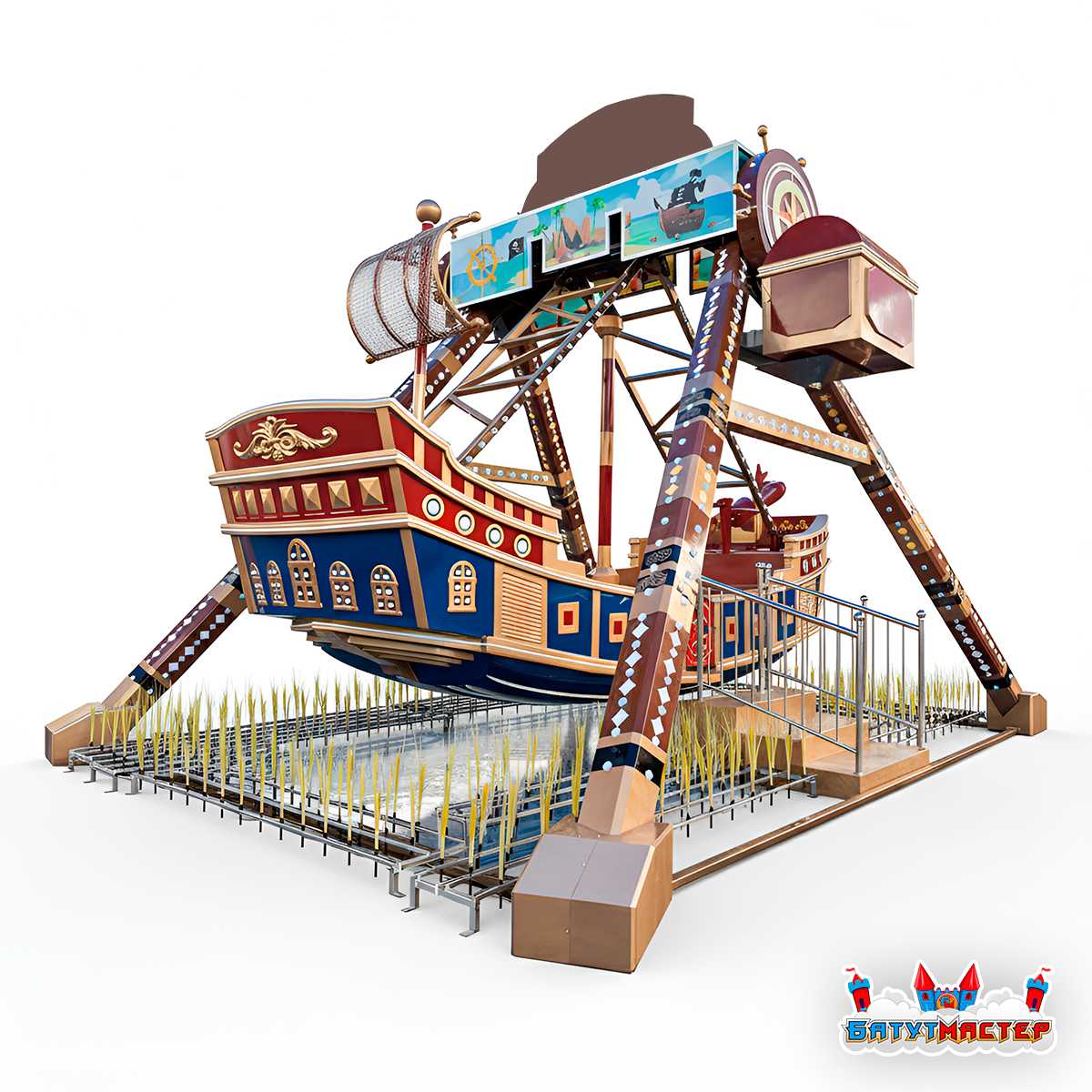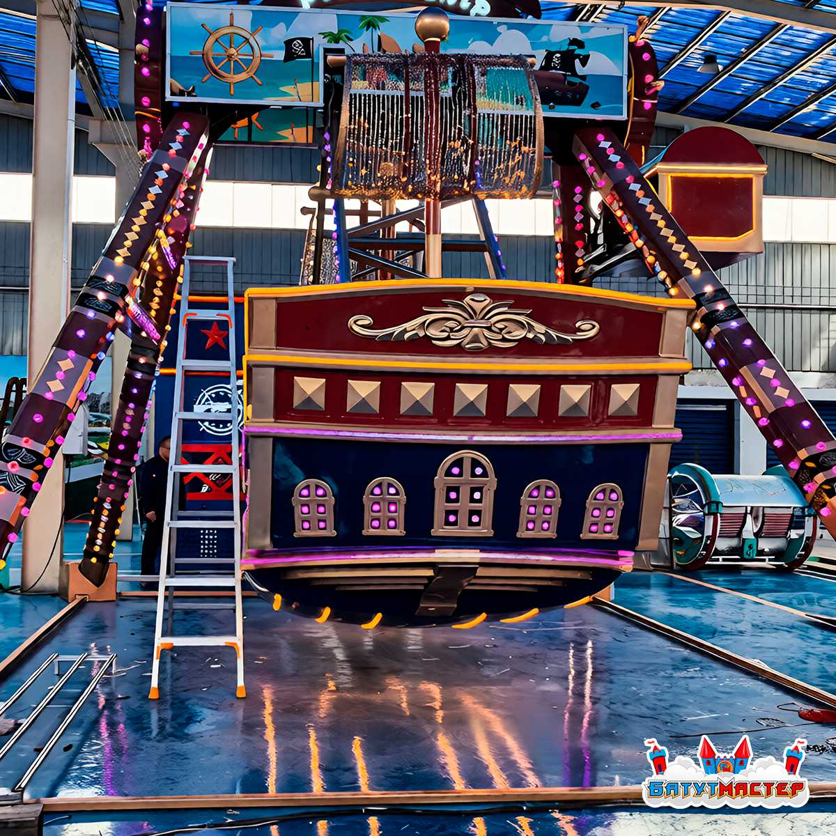 Внешний вид аттракциона сделан в классическом морском стиле, что добавляет ему колорита. На корабле установлены декоративные элементы в виде парусов, мачт и пиратских символов, создавая атмосферу настоящего морского путешествия. Особое внимание уделено светодиодной подсветке, которая делает аттракцион ярким и заметным даже на больших расстояниях. А тематическое музыкальное сопровождение усиливает эффект погружения в атмосферу приключений.
