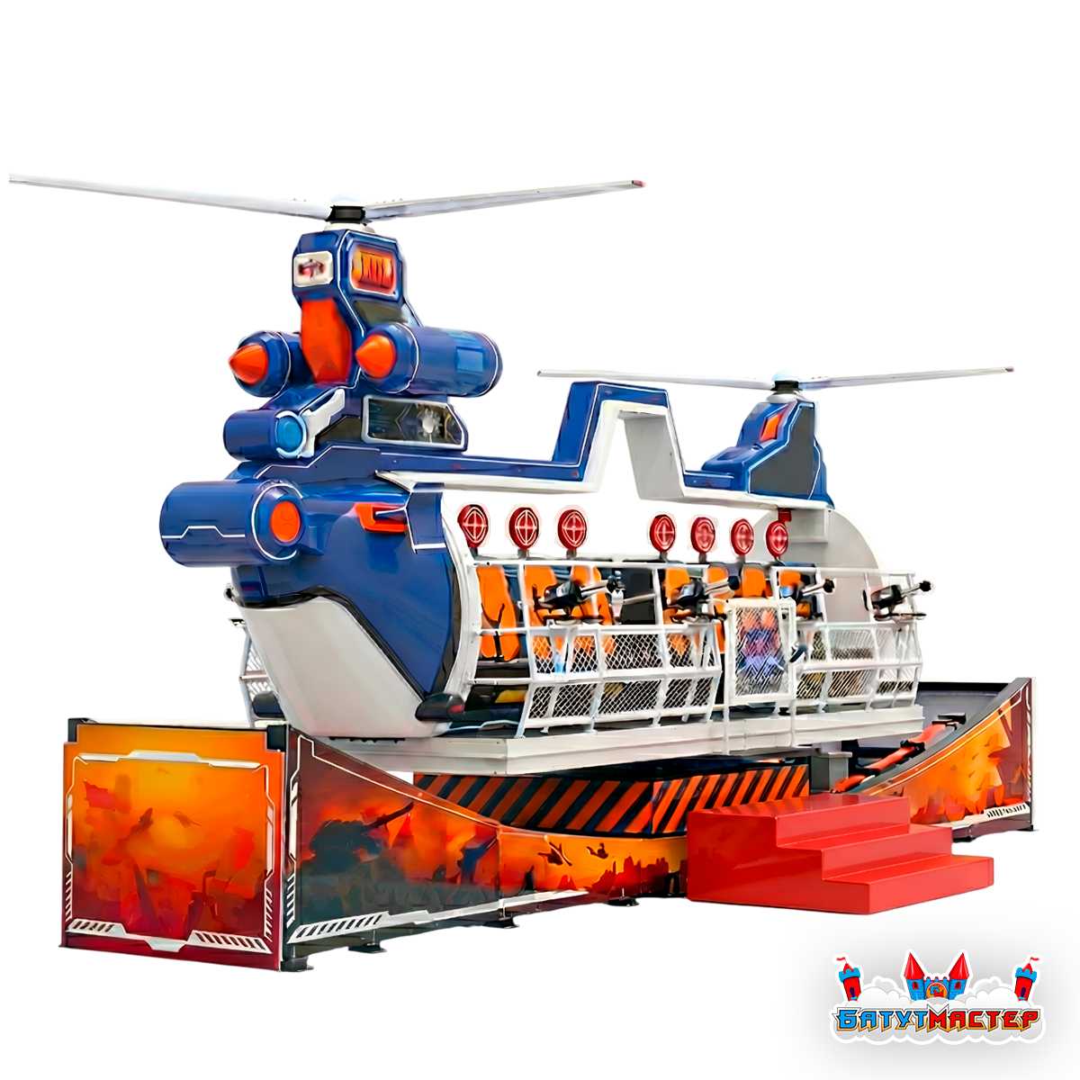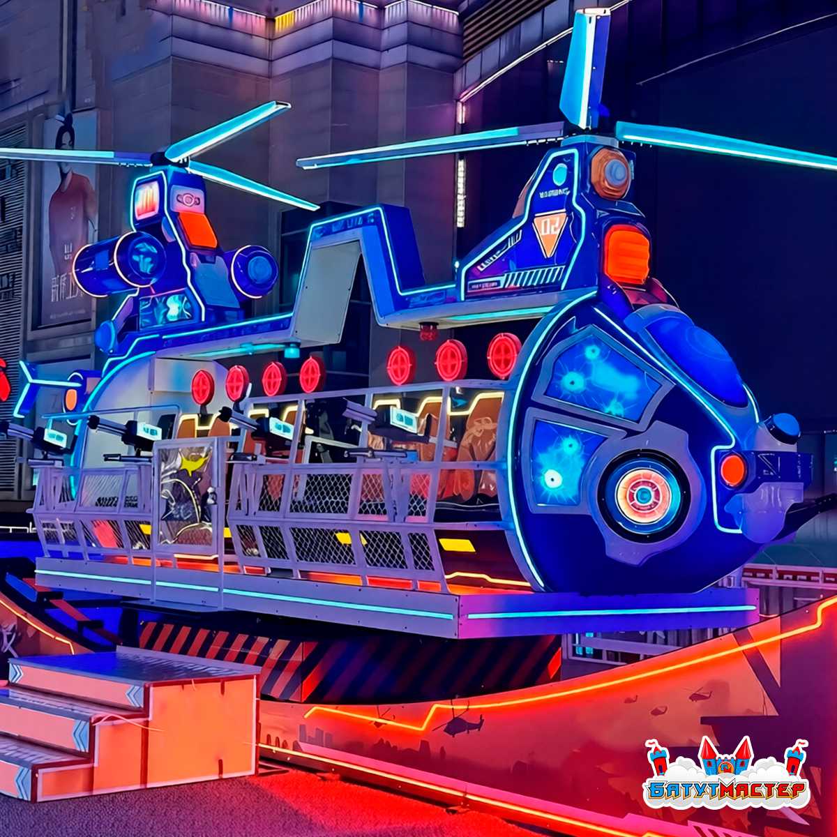 Яркий внешний вид: Аттракцион оснащен динамической подсветкой, которая привлекает внимание в любое время суток. В вечернее время LED-подсветка создает эффектный вид и привлекает большее количество гостей.