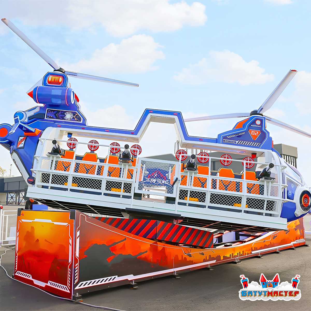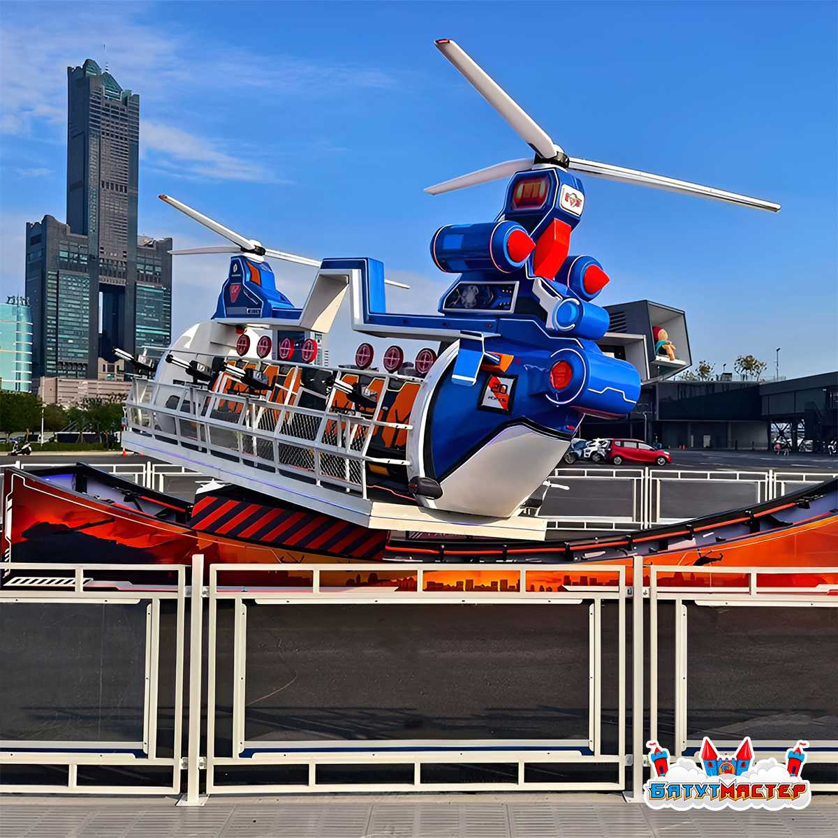 - Универсальность размещения: «Летающая машинка» подходит для разных типов локаций. Она может быть установлена в открытых парках аттракционов, на крытых площадках торгово-развлекательных центров, а также на временных площадках, таких как фестивали и ярмарки.