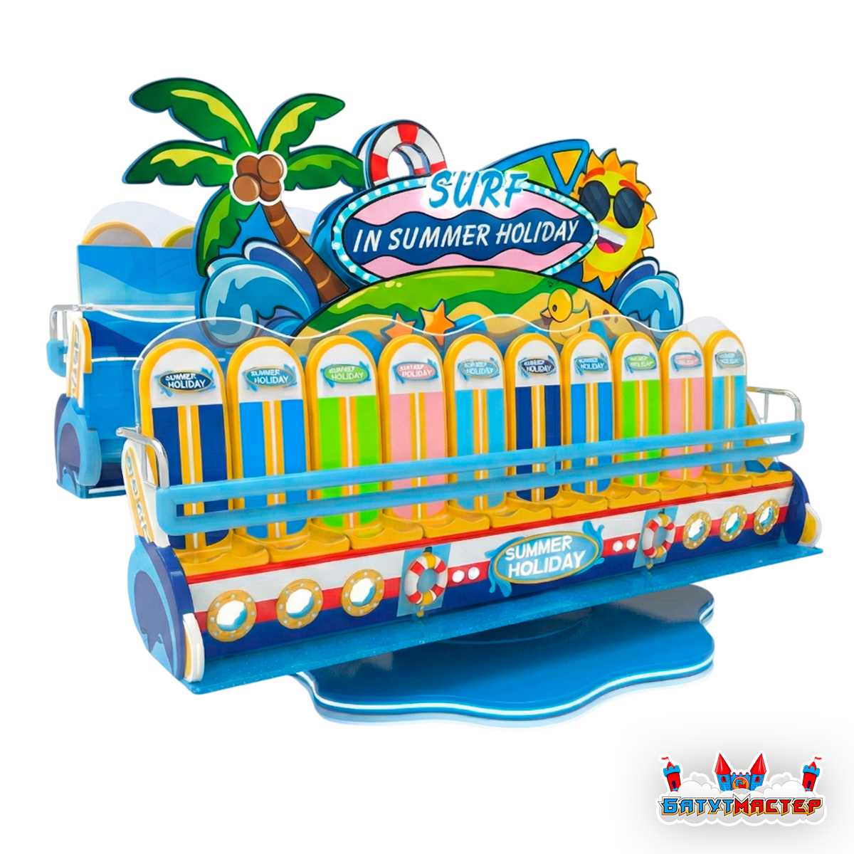 «Летний танец» — аттракцион класса «Летающая скамейка», оформленный в яркой летней морской тематике: пальмы, тропическое солнце в очках, морские волны и разноцветные доски для сёрфинга. Конструкция рассчитана на 20 пассажиров одновременно и занимает площадь 8 × 3,6 метра при высоте 3,2 метра. Несмотря на внушительную вместимость, аттракцион компактен и отлично вписывается в различные форматы площадок.