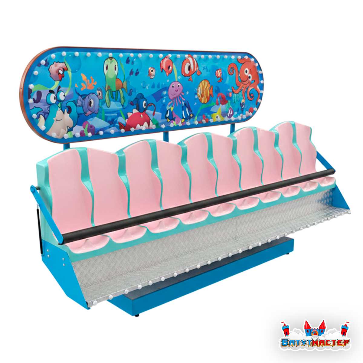 Каждое посадочное место оснащено металлическим защитным поручнем, надёжно фиксирующим пассажира на протяжении всего сеанса. Механизм движения построен на промышленных подшипниках с высоким ресурсом. Управление осуществляется через пульт с кнопками запуска, остановки и аварийного отключения — оператор полностью контролирует процесс. Система экстренной остановки срабатывает как в ручном, так и в автоматическом режиме.
