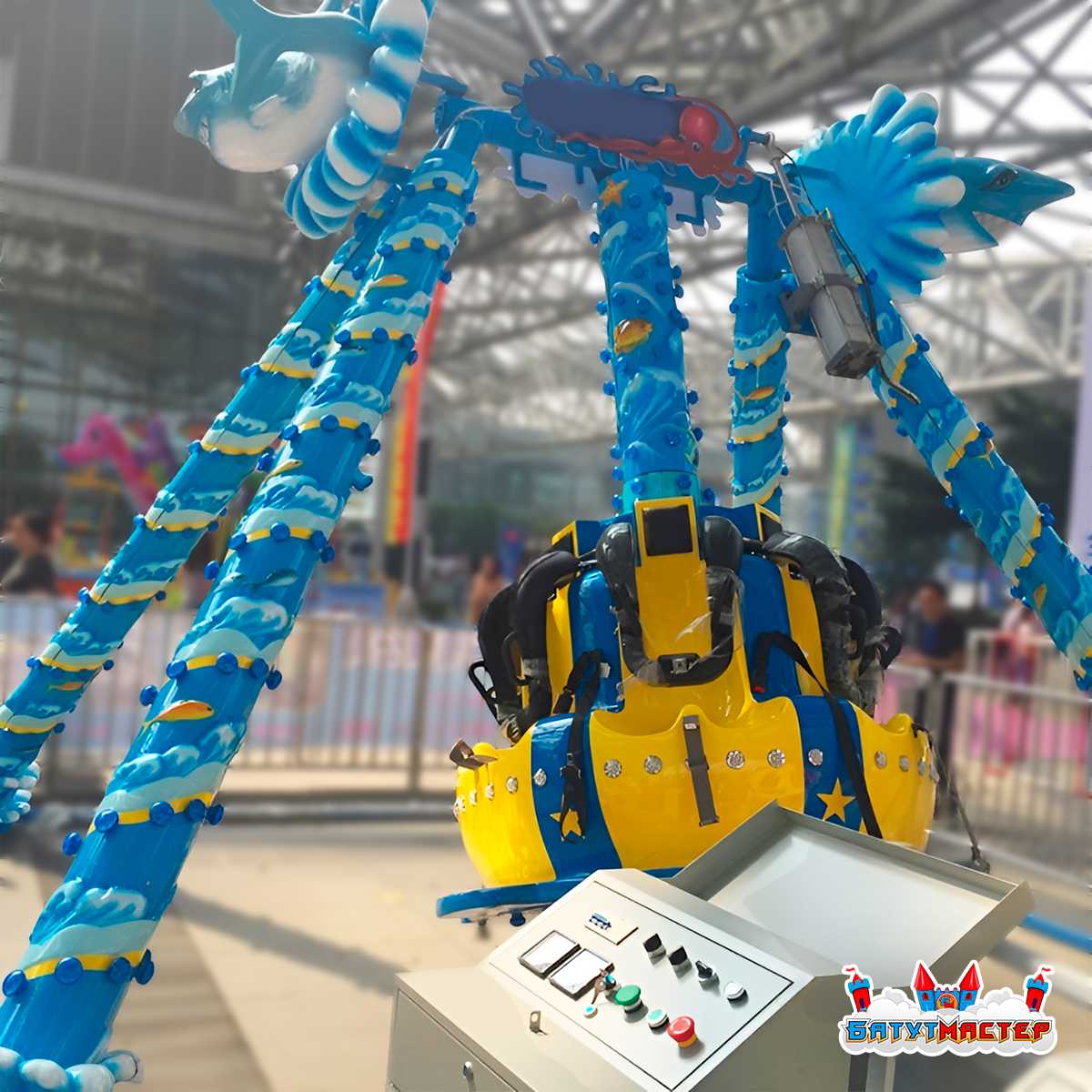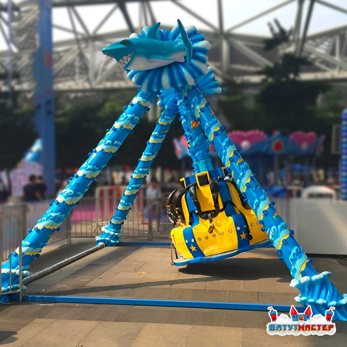 Маятниковые аттракционы относятся к категории с высокой пропускной способностью и минимальным временем цикла. 5 мест × высокая оборачиваемость = стабильный денежный поток даже при умеренном трафике площадки. Морской дизайн с акулами, осьминогами и эффектной подсветкой делает конструкцию визуальной доминантой — гости фотографируют её и публикуют в социальных сетях ещё до того, как садятся в кабину, обеспечивая вам бесплатное продвижение.