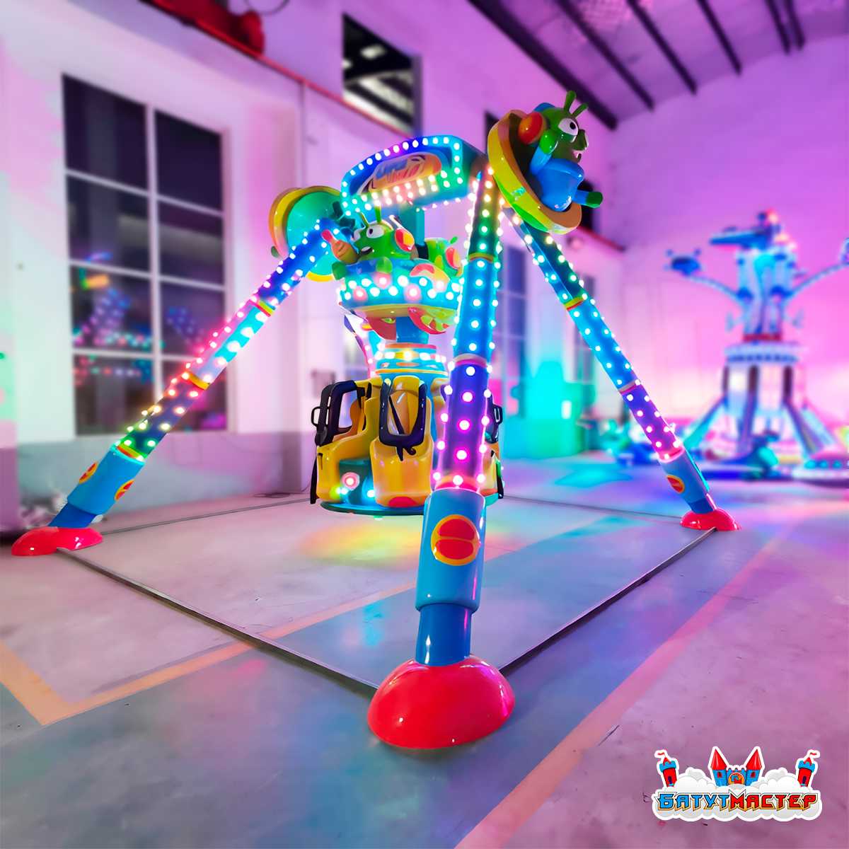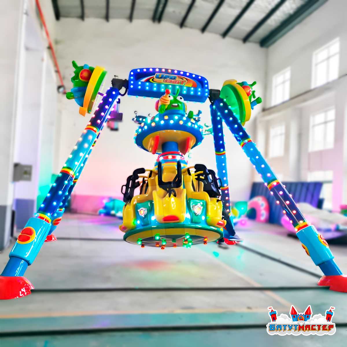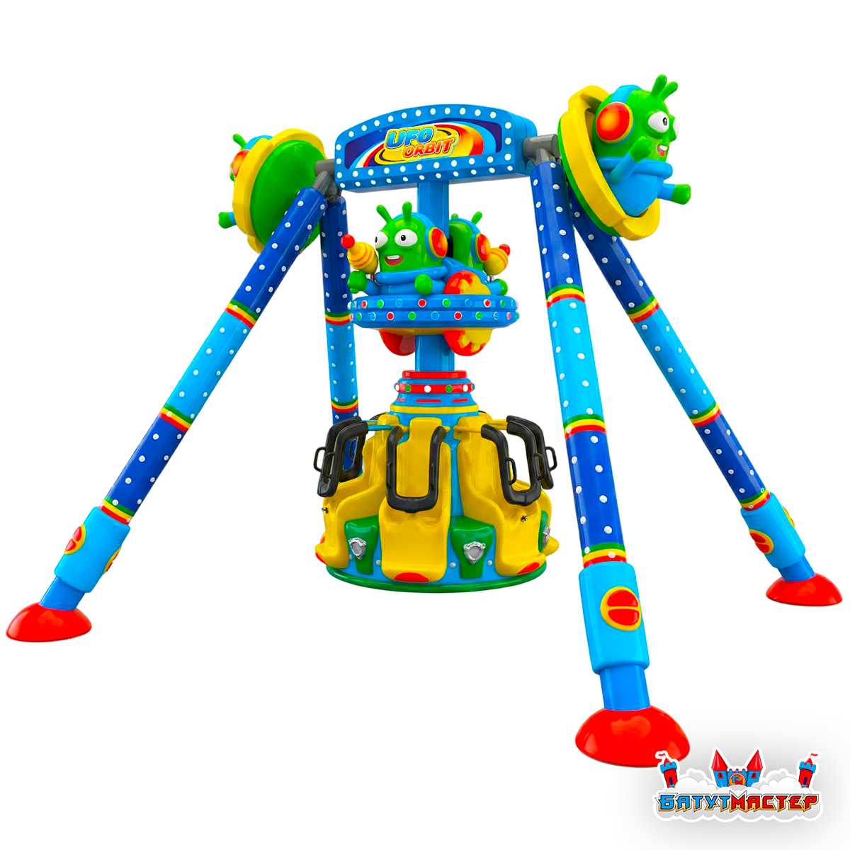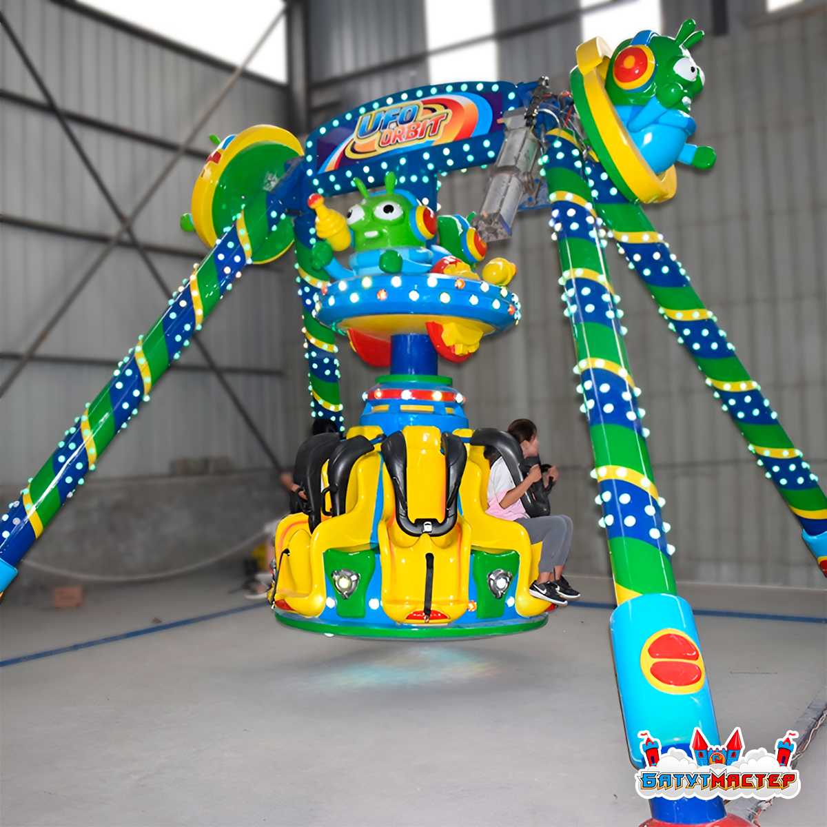 «Планетарное кружение» — это детский аттракцион класса «Маятник» в узнаваемом тематическом оформлении. Яркие инопланетяне, светящиеся тарелки и насыщенная сине-жёлто-зелёная цветовая гамма превращают аттракцион в настоящий магнит для детей — его замечают издалека и сразу тянут за руку родителей. Рассчитан на 6 пассажиров одновременно, что обеспечивает высокую пропускную способность и быструю окупаемость даже при умеренном трафике.