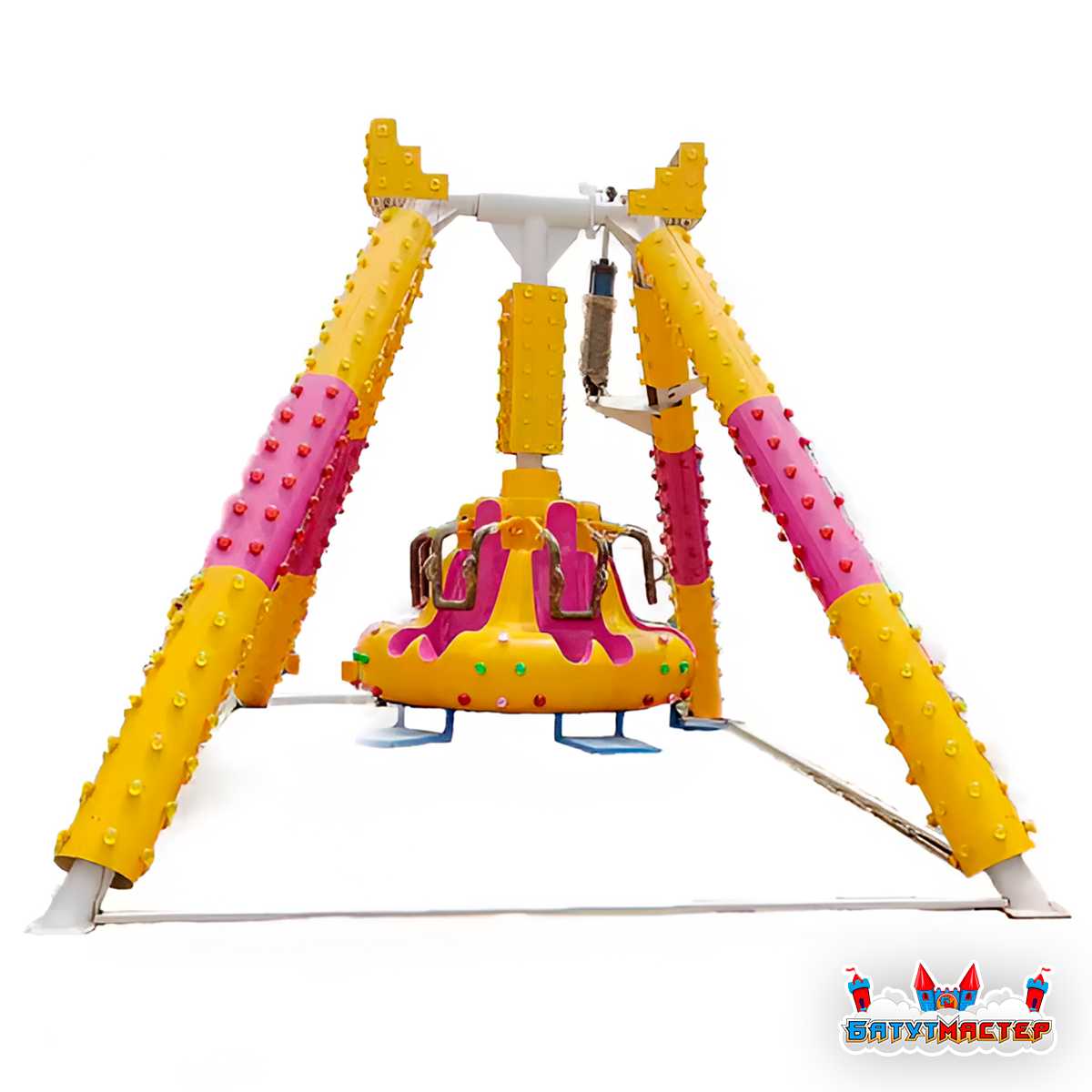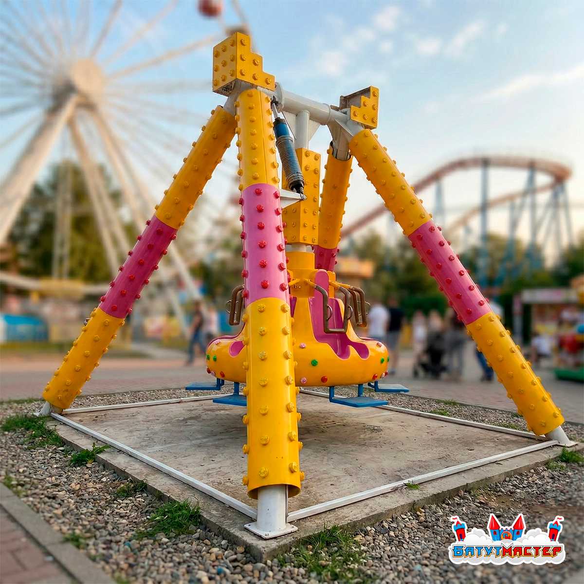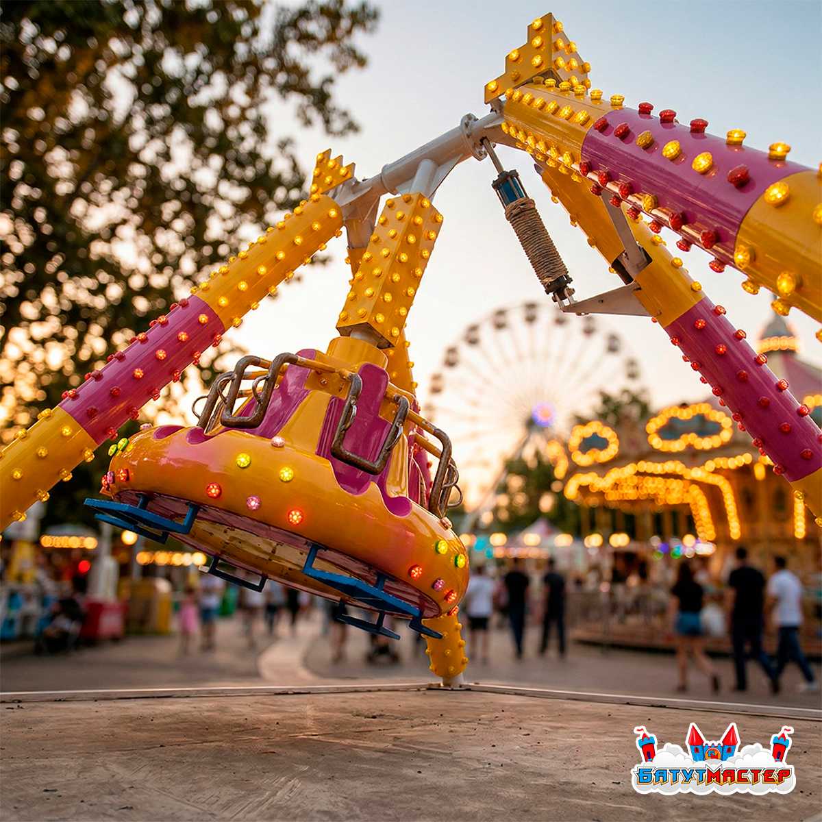 Аттракцион работает от сети напряжением 380 В и потребляет 10 кВт мощности — это экономичный показатель, что напрямую влияет на операционные расходы бизнеса. Несущая конструкция изготовлена из высокопрочной стали, кабина — из стеклопластика, устойчивого к атмосферным воздействиям и механическим нагрузкам при интенсивной ежедневной эксплуатации. Привод — пневматический цилиндр с электрическим управлением, обеспечивающий плавный и контролируемый разгон. Площадь покрытия составляет 6,6 × 5,8 × 4,5 м. Вместимость кабины — 5 мест.