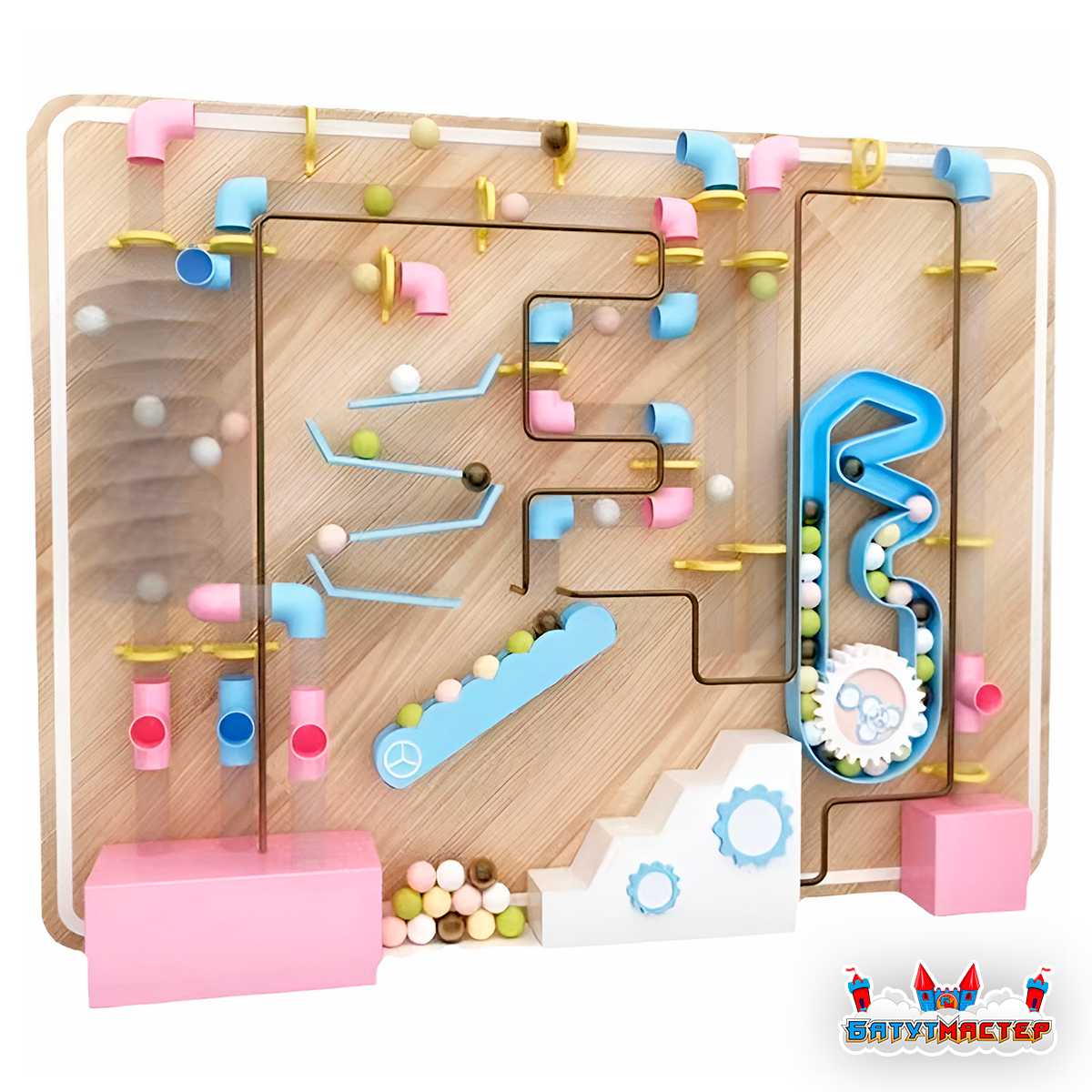 Основой пневмолабиринта является поток воздуха, который подхватывает лёгкие шарики и запускает их в движение по системе прозрачных труб.